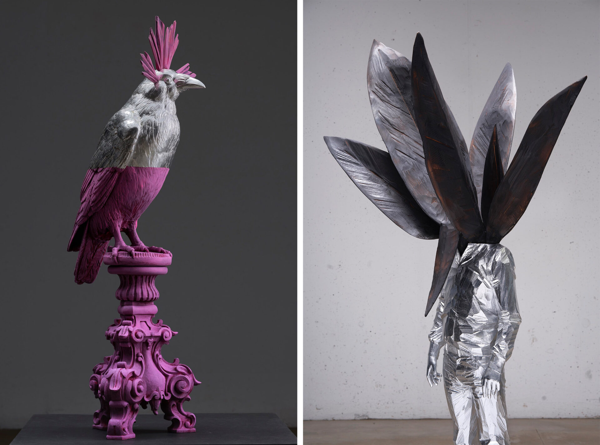 Left: “Fra poco arriverà” (2022), lindenwood, acrylic, and aluminum leaf, 76 x 23 x 33 centimeters. Right: “Oceano verde dietro alle spalle” (2023), lindenwood, burned wood, aluminum leaf, 148 x 80 x 74 centimeters