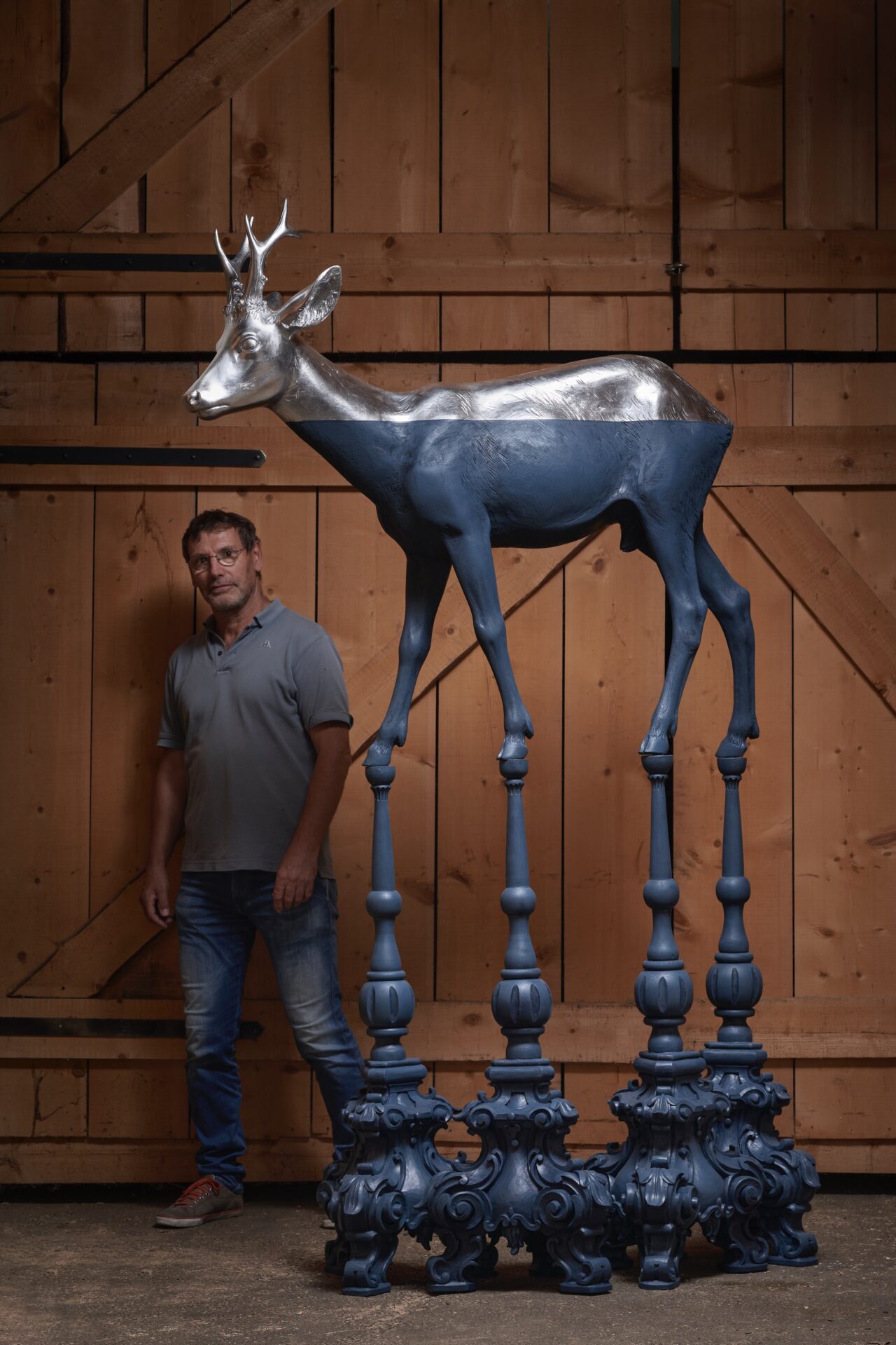 “Quattro zoccoli in paradiso (blue)” (2023), lindenwood, acrylic, and aluminum leaf, 235 x 150 x 70 centimeters