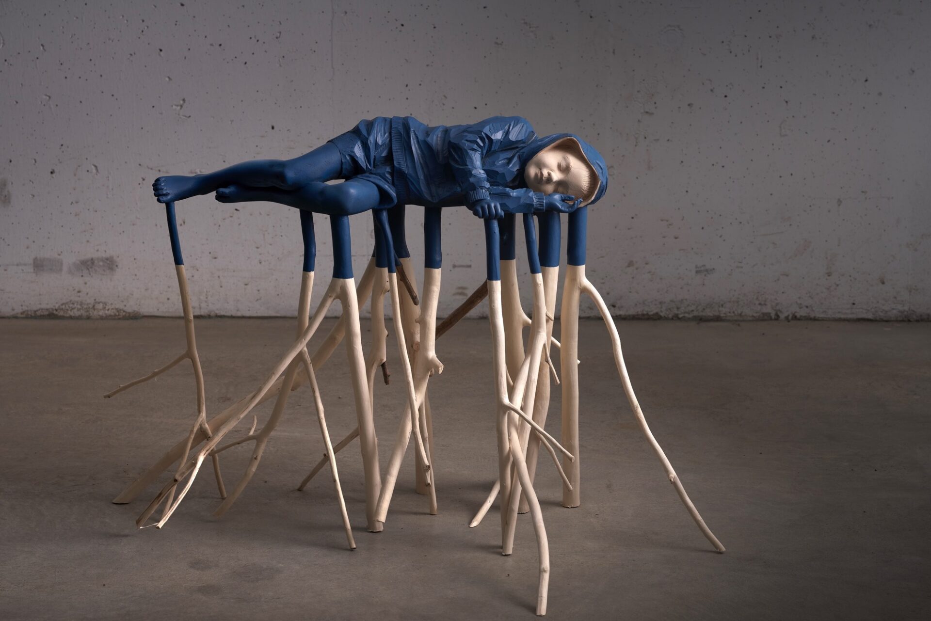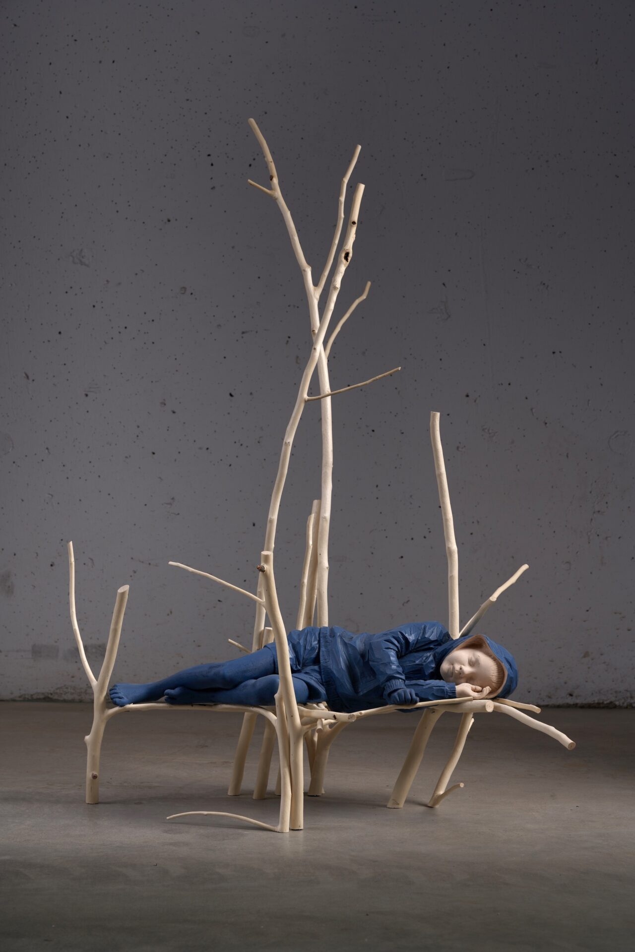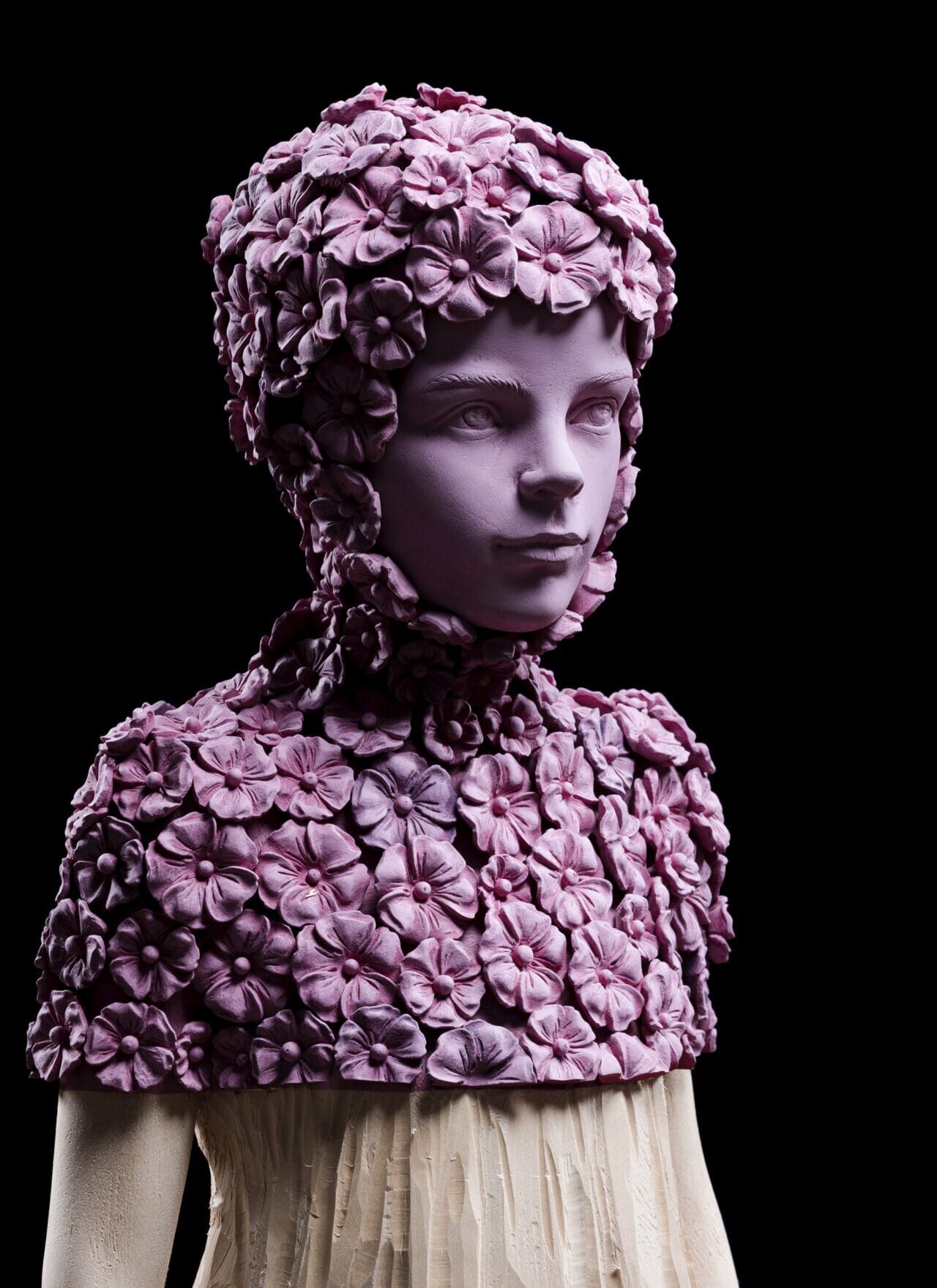 Verginer uses linden, or basswood, to chisel life-size sculptures of birds, bears, and human figures who merge with their natural surroundings. For example, in “Il fiume e la notte,” or “the river and the night,” a child sleeps atop a thicket of branches, simultaneously calm yet balancing precariously on thin supports. And in “Fiore del giardino,” or “garden flower,” a child’s head and shoulders are tightly enveloped with magenta flowers like a cloak.