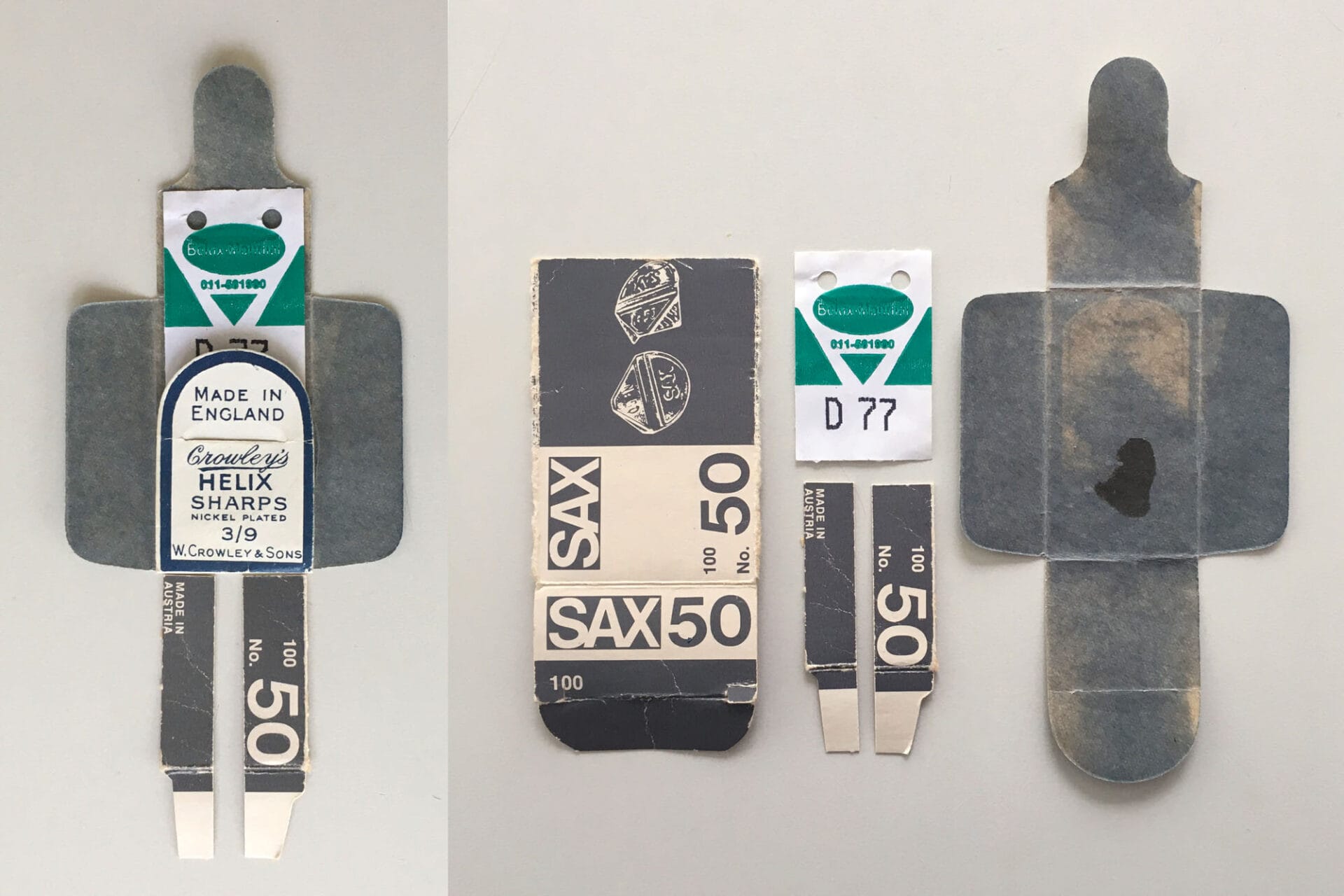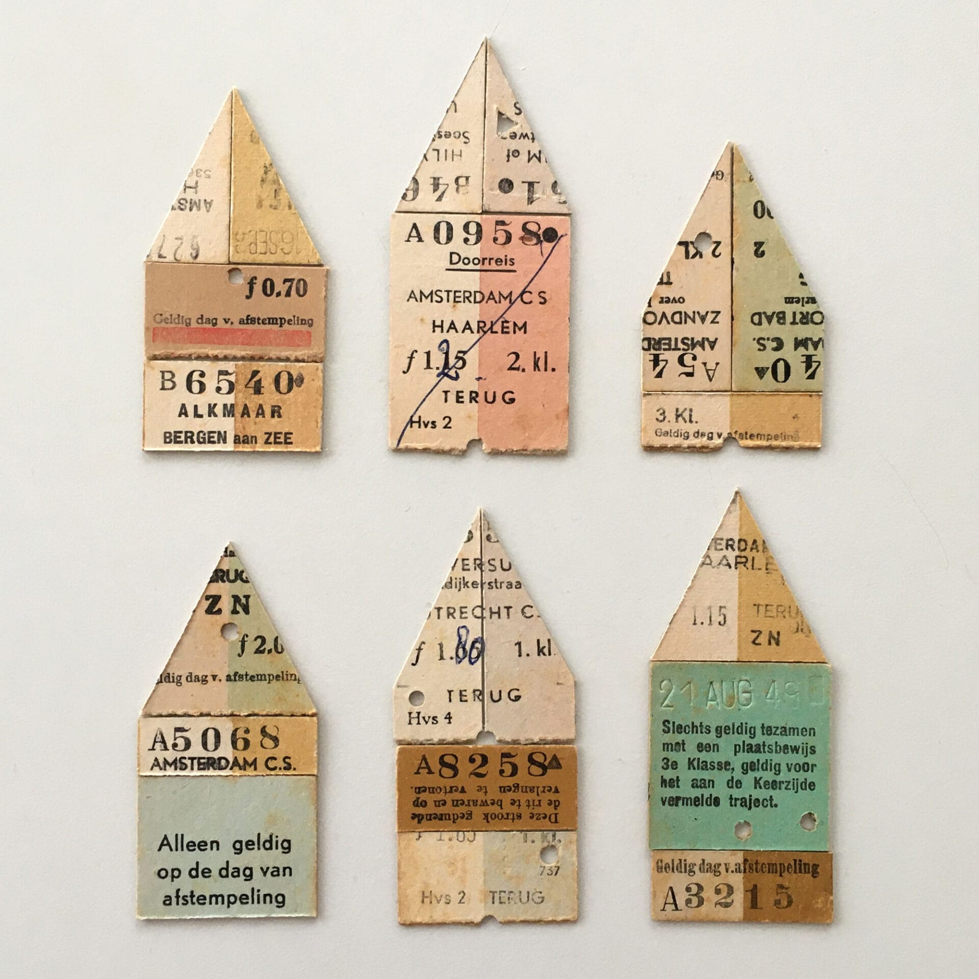 Brunt collects materials from every place imaginable. From papers she finds in chocolate boxes and antique playing cards to instruction leaflets and train tickets, the artist sources both aged pieces and contemporary media gathered from her daily life. As she accumulates promising morsels over time, she organizes each fragment into boxes and old stamp albums, where they await their addition into a montage.