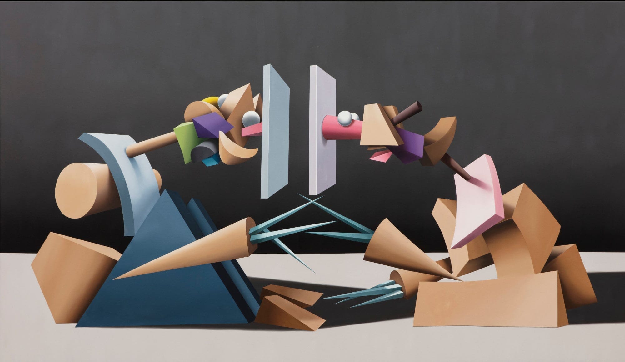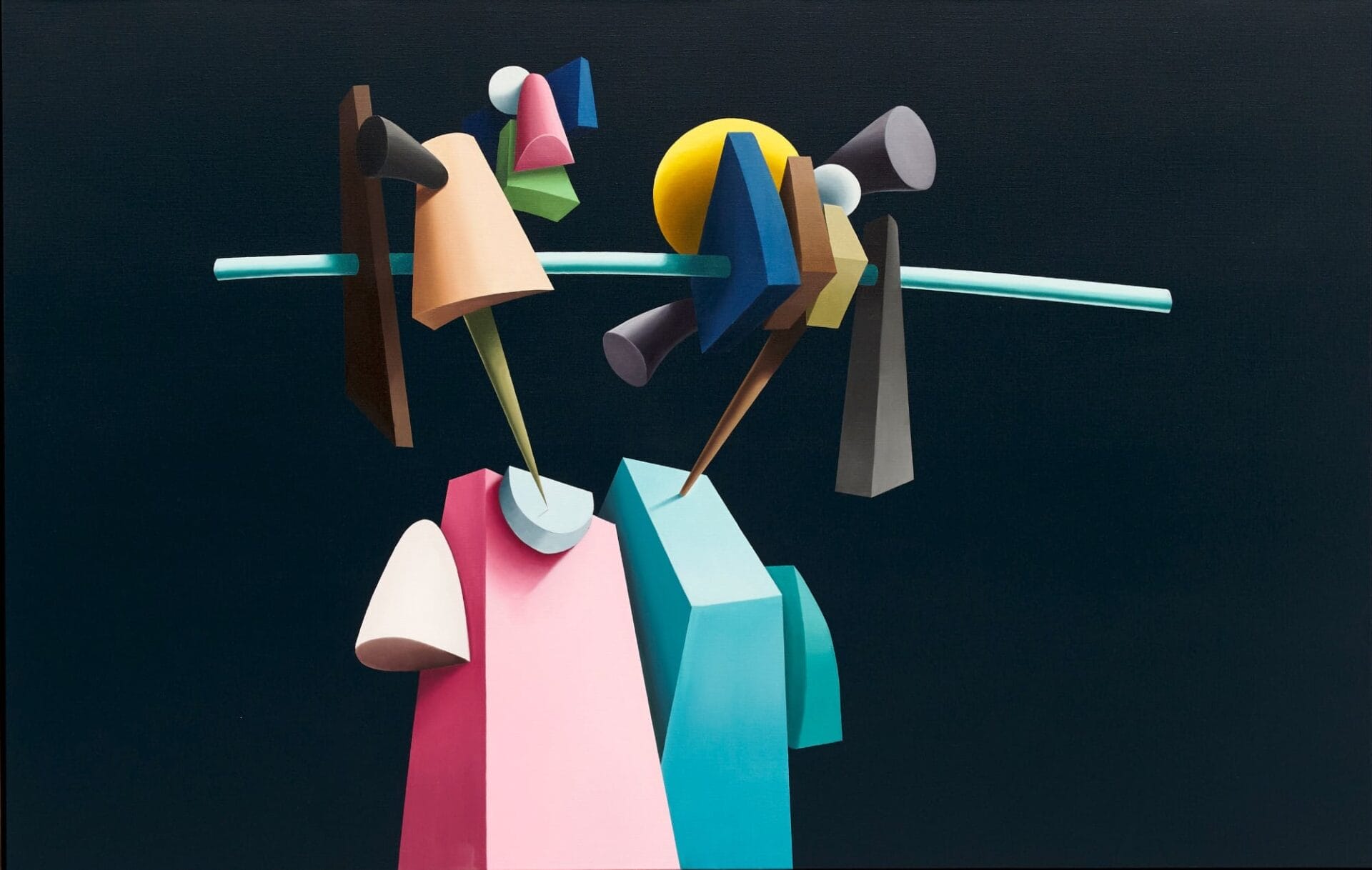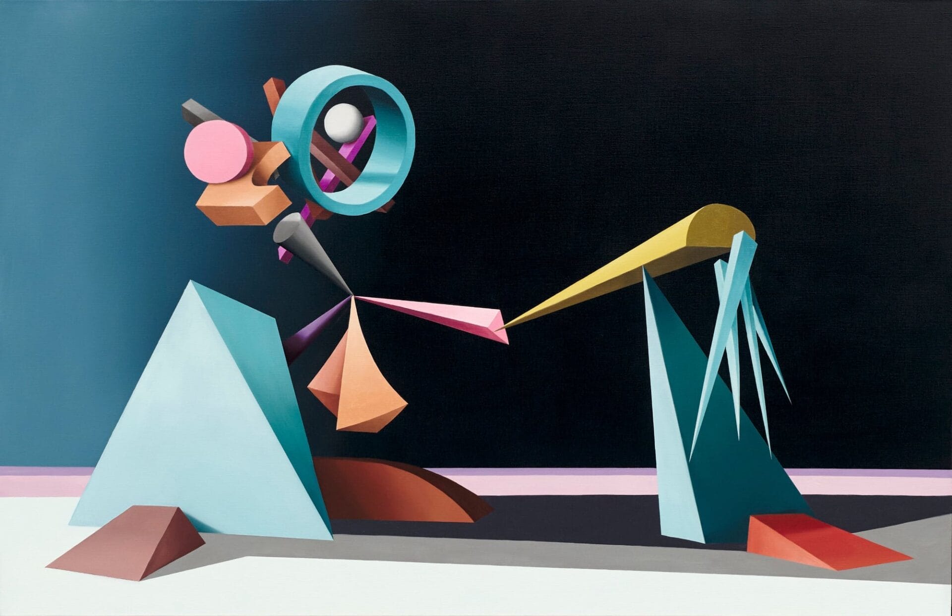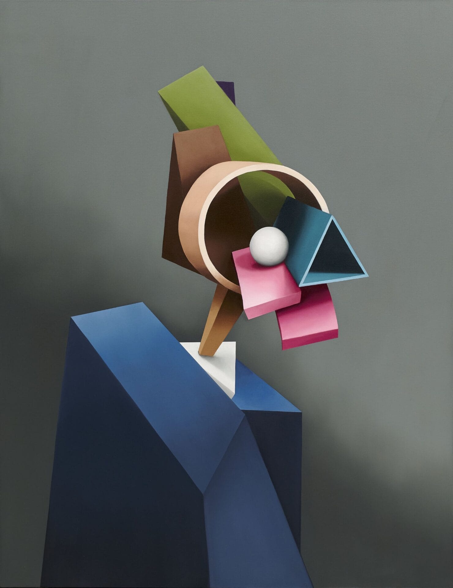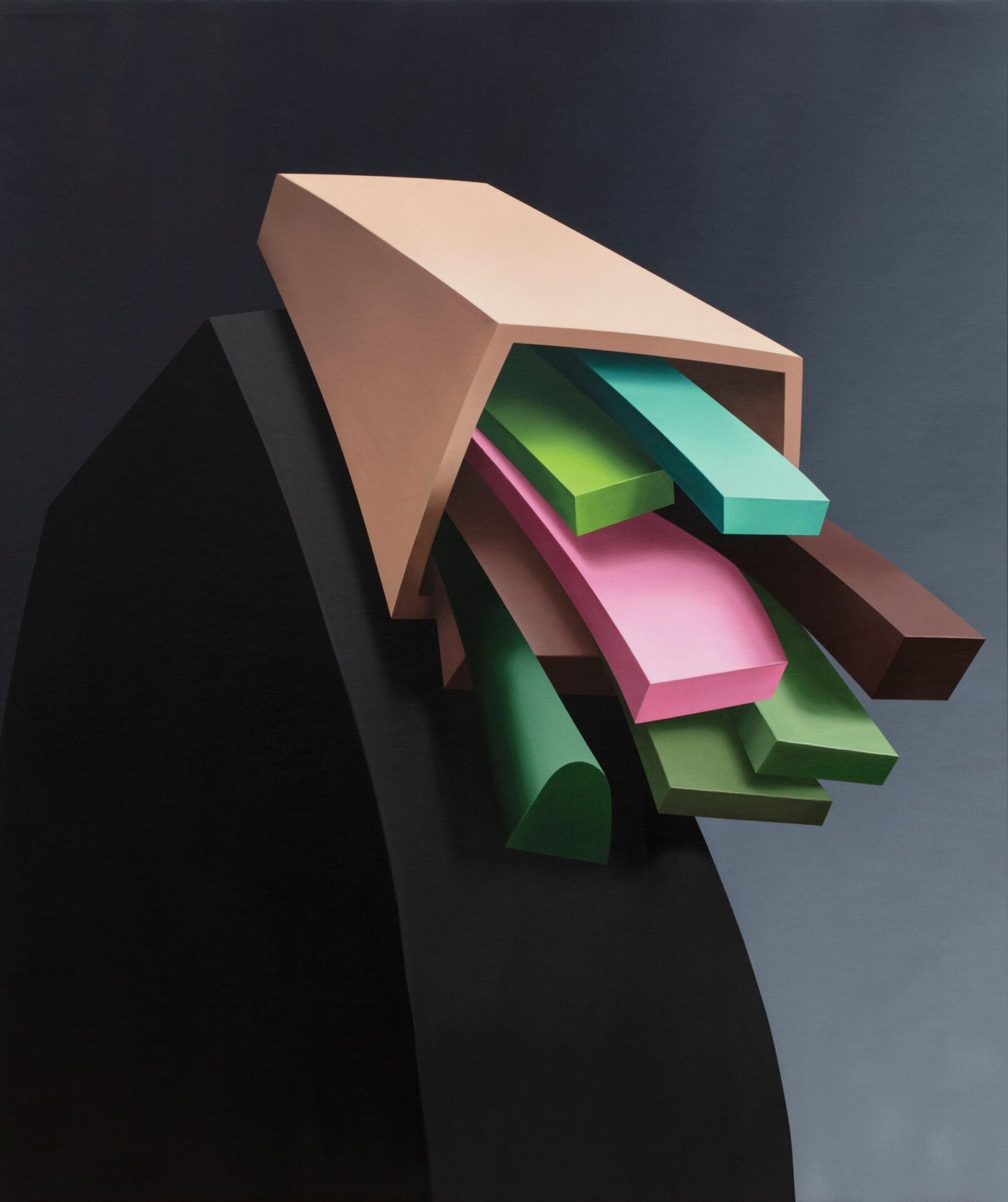 Like a jazz musician who practices improvisation and gains confidence in spontaneity, Kinsella has learned to follow his intuition. He might layer a pair of bubblegum pink planks or bisect a face with two peach columns, decisions that, like chord progressions and syncopation in an unrehearsed run, are made more interesting by their surrounding components. “You can look at sheet music and understand the individual notes themselves,” the artist says, “but it’s only when they’re assembled and played that you really get the true magic of it.”