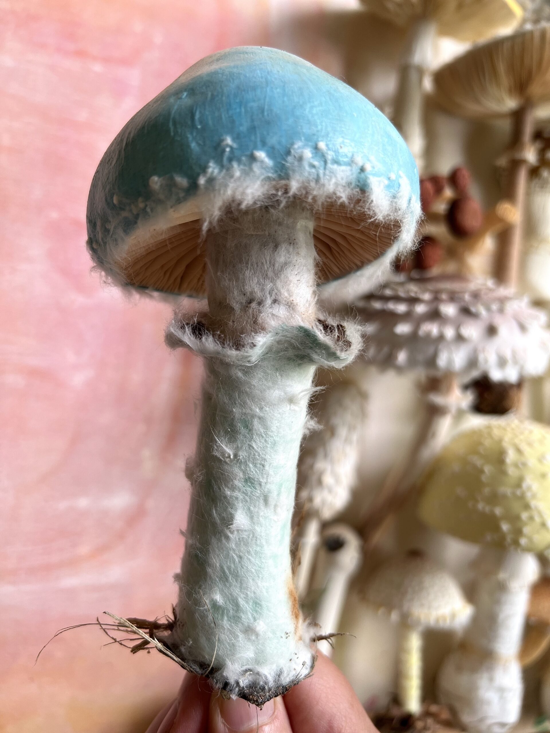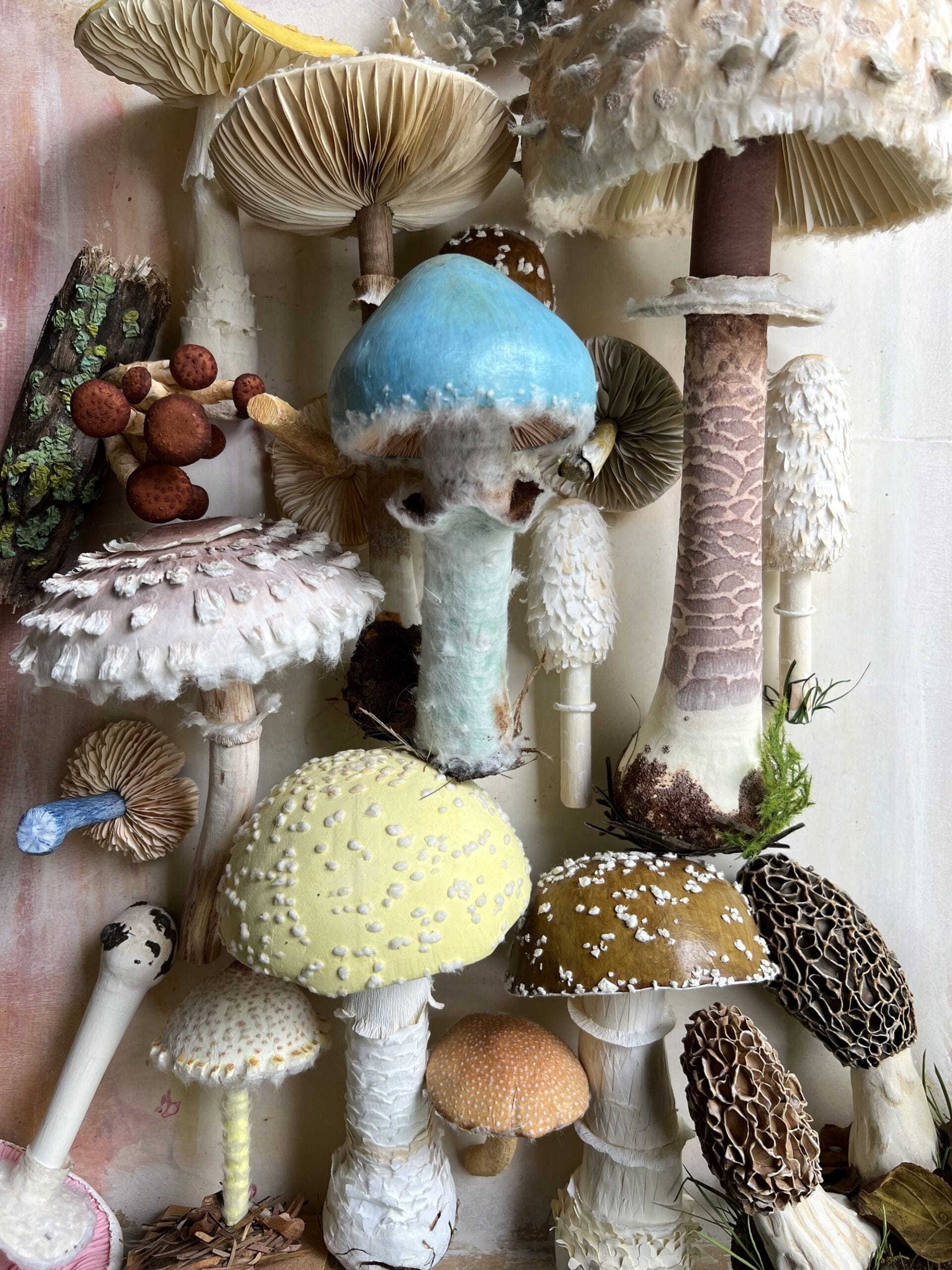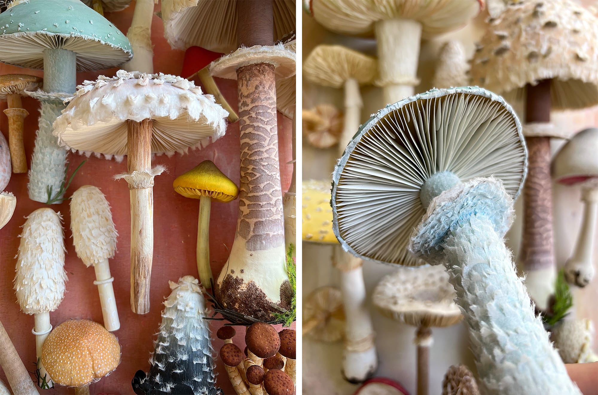 Fungi is impossible to keep looking fresh for the week-or-so it takes to complete each piece, so the artist takes some minor liberties with color or texture but attempts to stick to nature as much as possible. “I often wake up in the morning with new ideas—new ways to use (the material) in a way that makes the mushrooms look real,” she says. “There’s an endless amount of things that could be created. I want to make one of everything.”