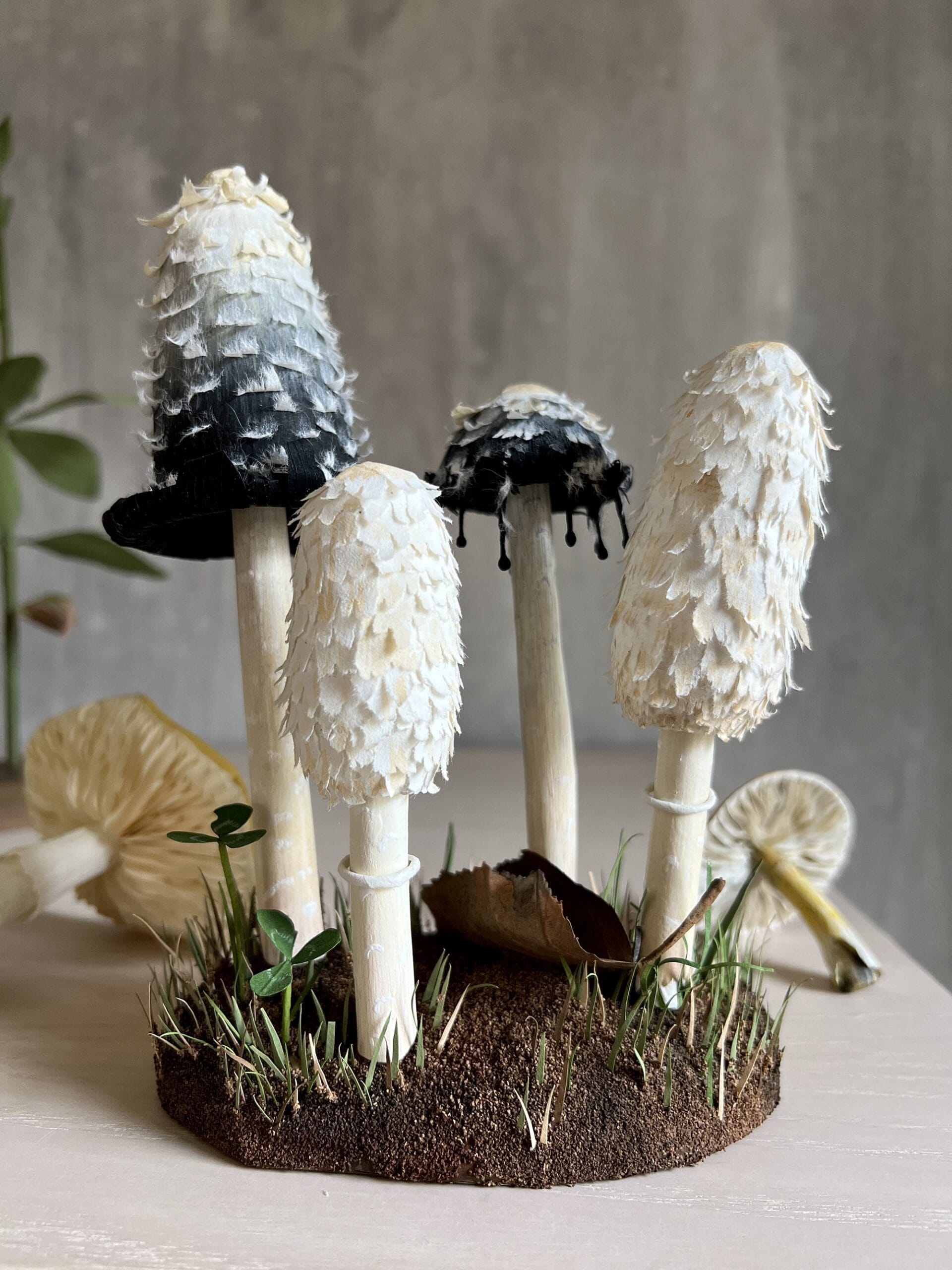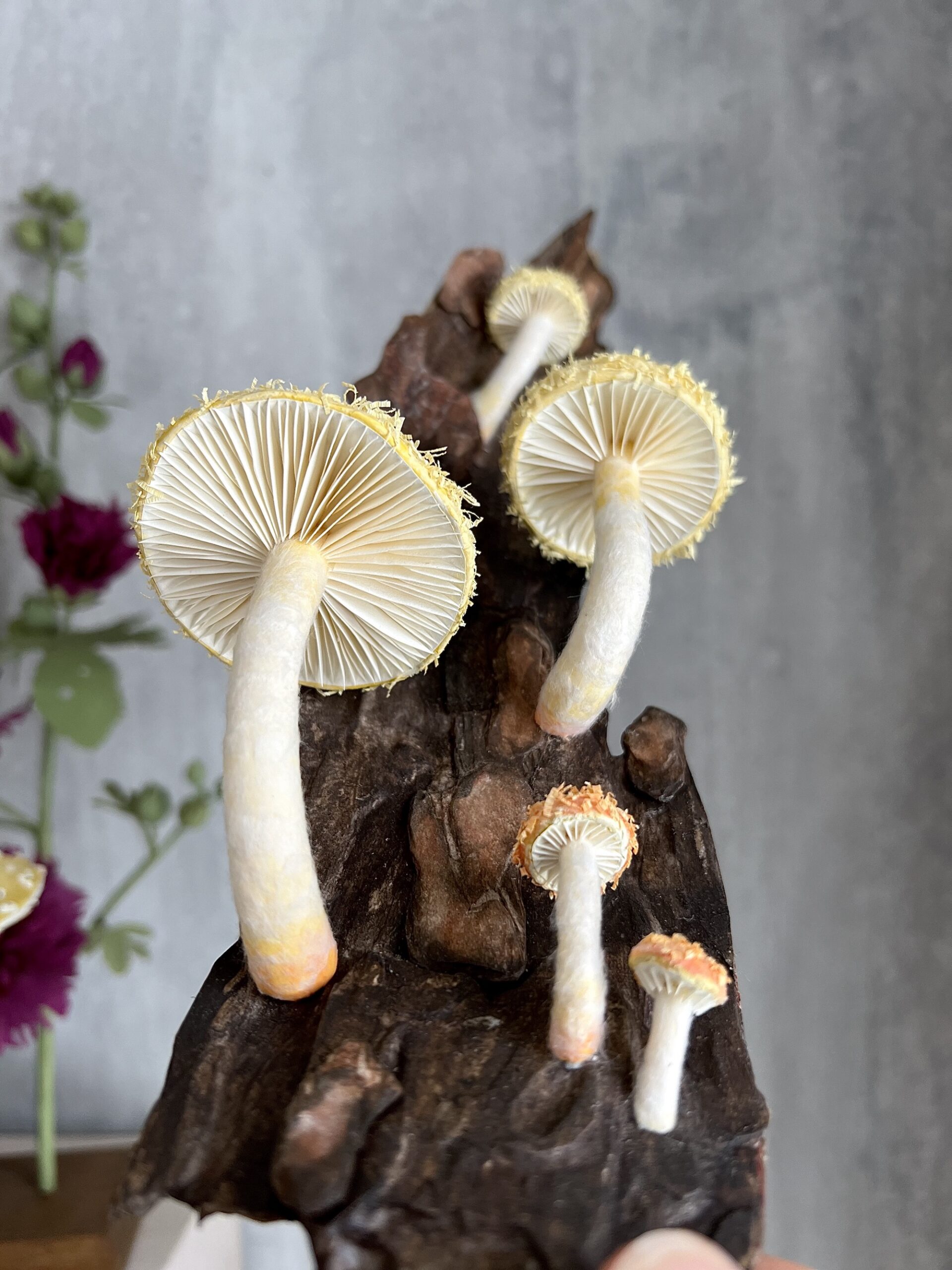 Wood has always been interested in working with the medium, and about ten years ago, she began making realistic plants. “At first, I looked at photographs and botanical illustrations to understand specimens,” she tells Colossal. “It became clear quickly that I needed to have real plant material to examine. I think it is the only way to truly understand the parts and how to sculpt them.” Only within the last year has Wood begun crafting mushrooms, carefully cutting tiny strips of paper or utilizing its inherent pulpiness to create fuzzy details.