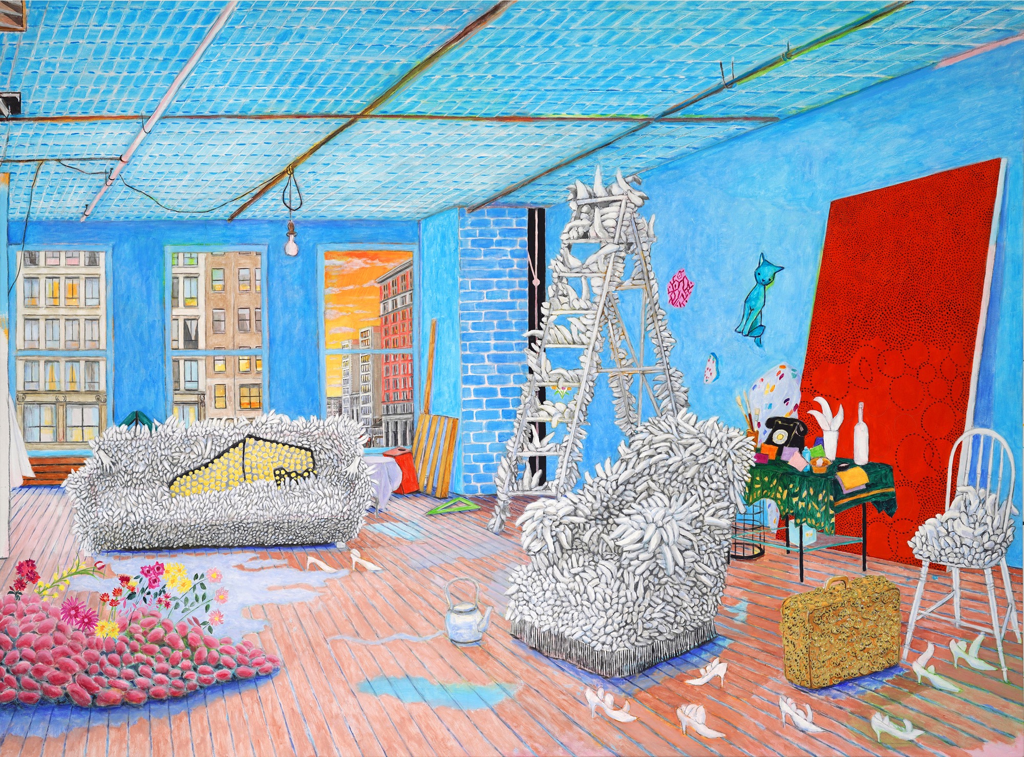 “Kusama’s Studio” (2024), gouache on board, 52.1 x 76.4 centimeters