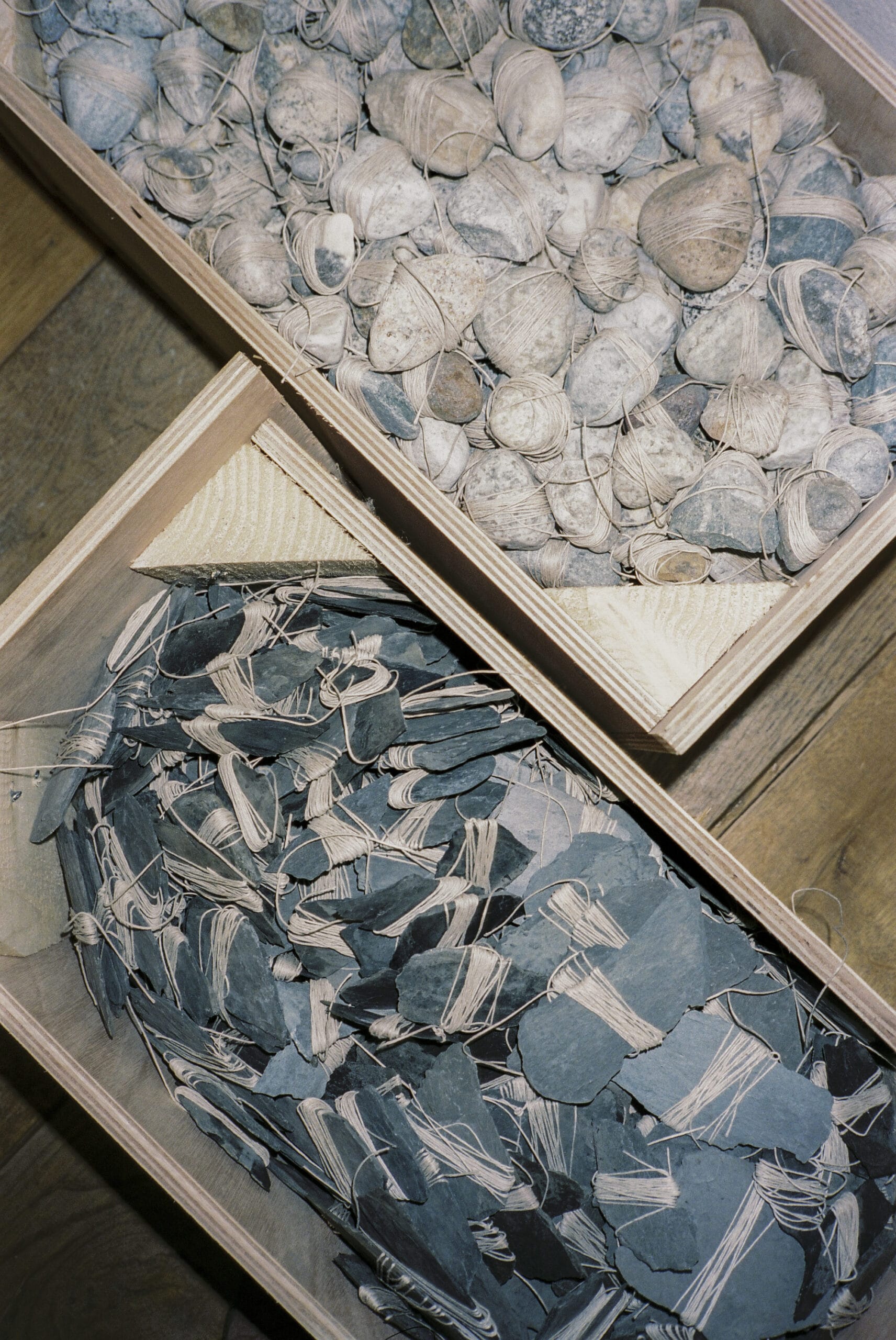 Over time, these efforts started to inform his practice. “Intuitively, I began tying the stones to strings, and each day, I added more,” Kooyman says. “The days spent tying the stones turned into weeks, and I couldn’t get enough of the rhythm of this simple activity. It brings me back to myself, to memories of the area, and to the constant desire to simplify my daily existence.”