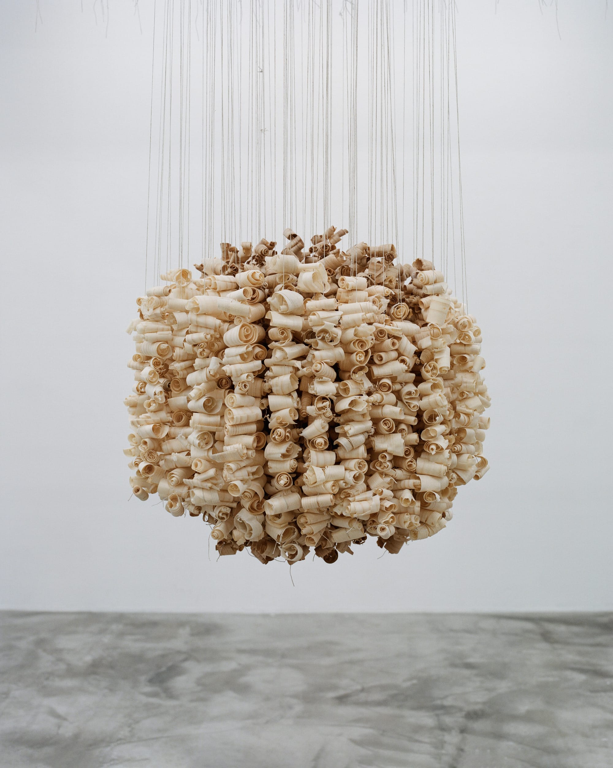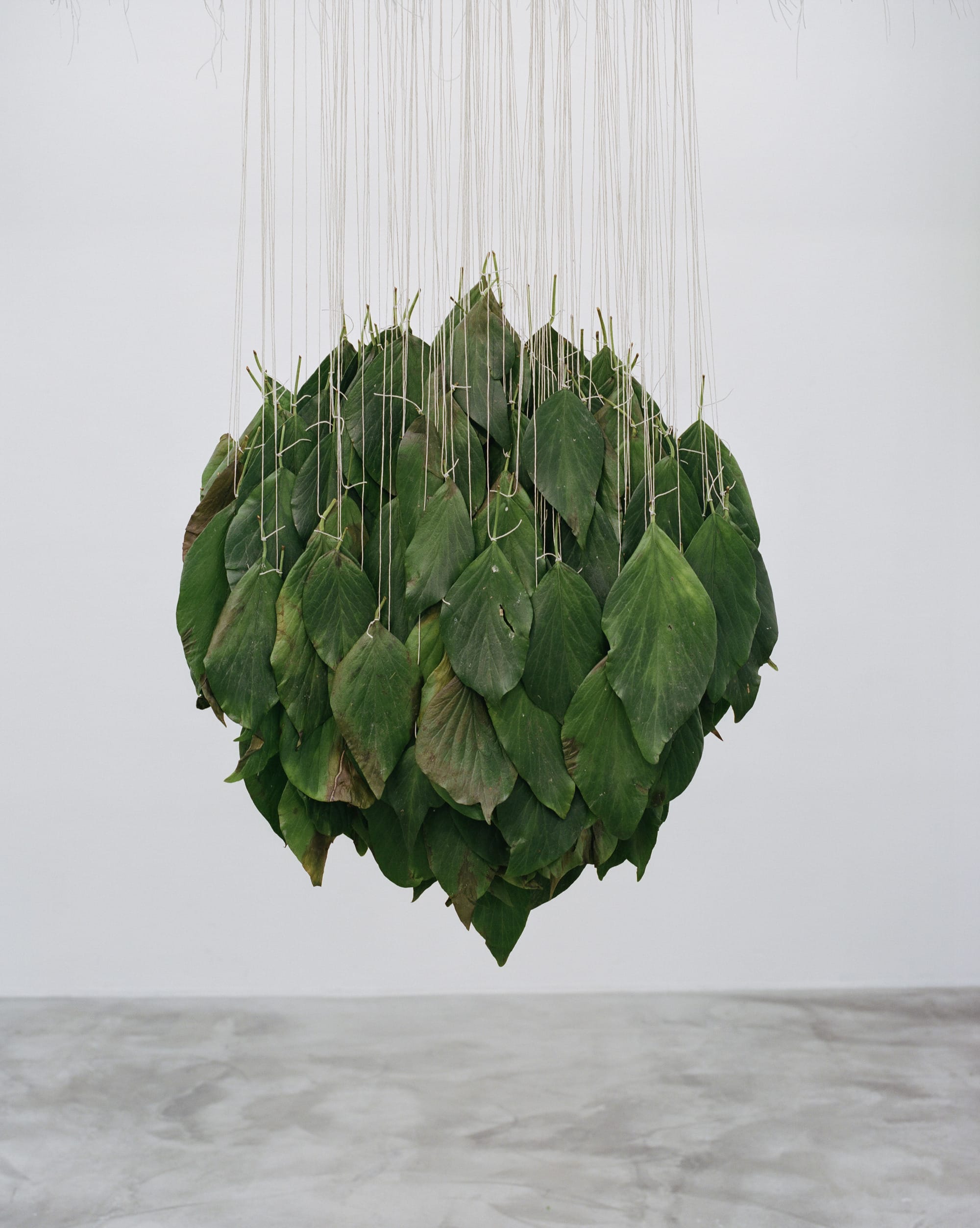Trekking up and down mountains, often with 30 kilograms of stones on his back, Kooyman contemplates the idea of gravity, which plays a large role in his suspended installations. From slate stones and river rocks to large leaves and curled slivers of tree bark, the artist creates assemblages of natural materials in consistent circular forms. Evoking moments of stillness, almost as if pausing time, each clustered entity awakens the spirit of France’s Southern Alps until Kooyman eventually dismantles the piece, returning each rock and leaf back to their origins, thus repeating the cycle.