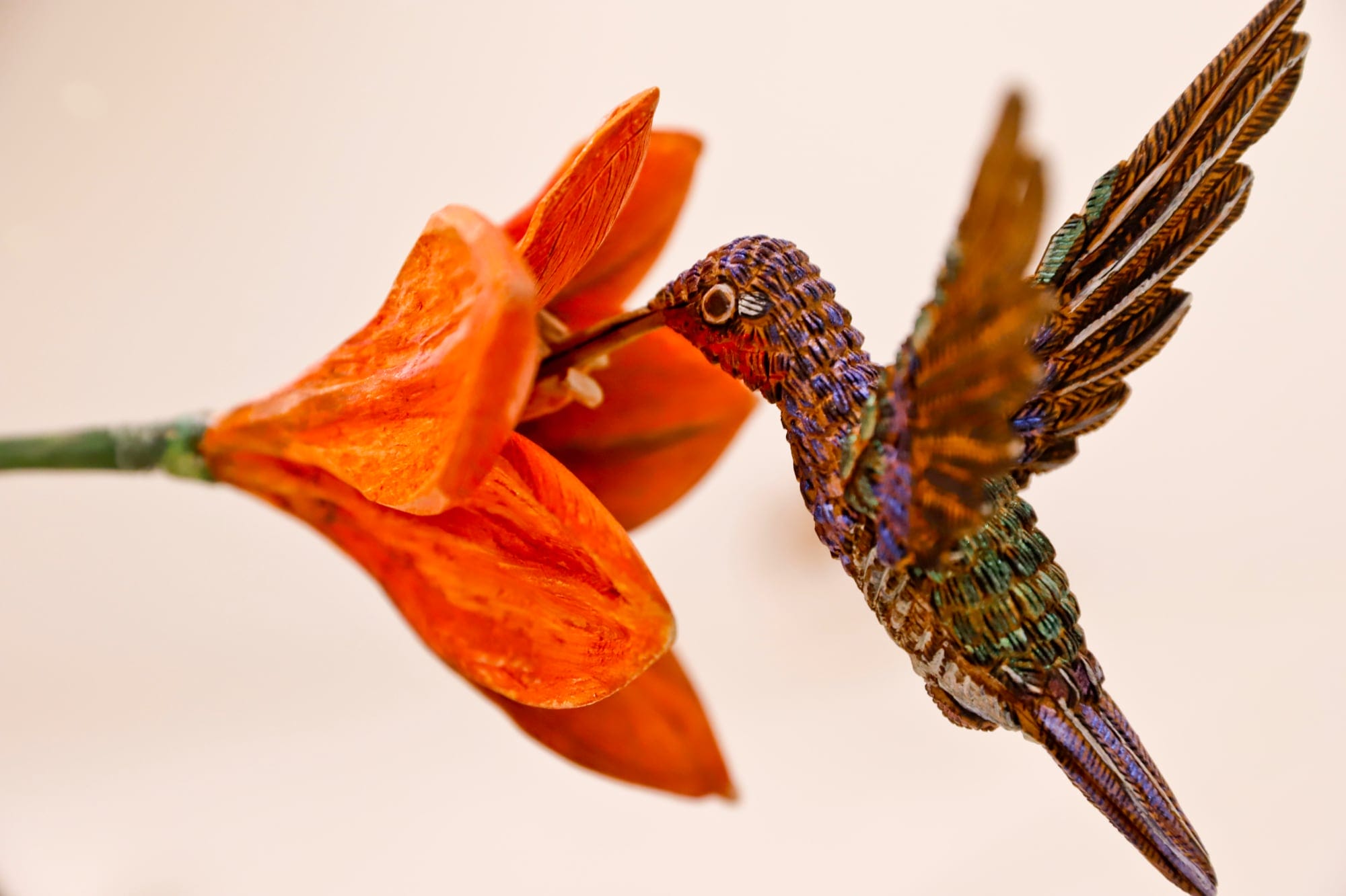 Almeida frequently returns to the hummingbird as a motif in his work, and in this exhibition, the diminutive creature appears with its beak piercing a lush orange flower. Painted in purples, greens, and oranges, the iridescent bird symbolizes a connection to “rainbow(s), water, and the spirit of the forest,” the artist says, and is an ideal motif for the ways something so small can reveal a broader connection to place, nature, and belonging. “These moments,” he adds, “are very dear and important, in the sense of realizing that it is something bigger, that it is a vibration, that it is a connection with my history.”