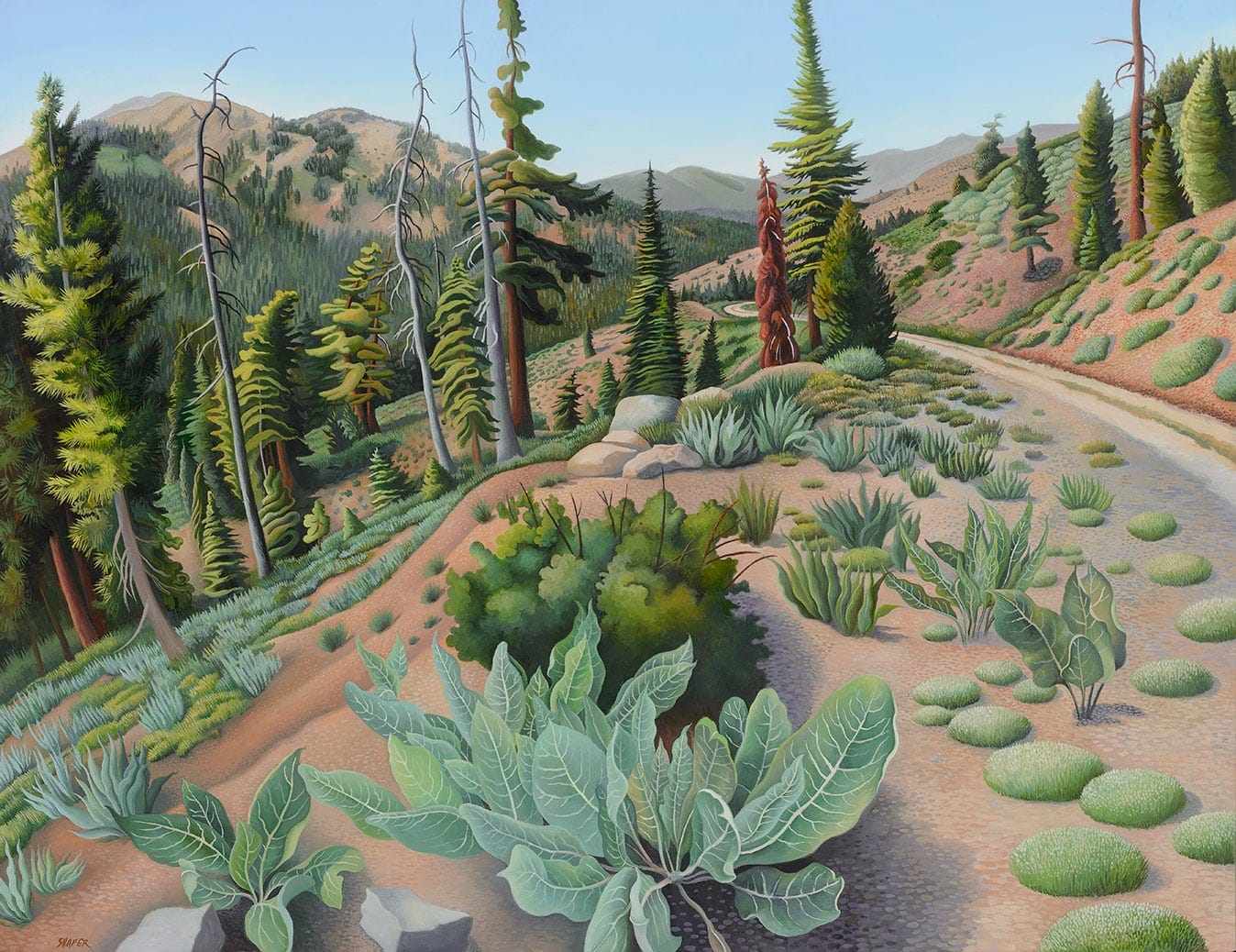 Having lived in the Tahoe area for several years, Shafer’s works sometimes document a landscape that’s since undergone a significant change. Cell towers pop up atop mountains, new animals and insects find their way to the region amid warming global temperatures, and populations contract and expand, bringing more people and foot traffic to an area. Spanning two decades, numerous locations, and multiple seasons, her paintings create a rich tapestry of life as it was. “If you love something, then you feel a responsibility to take care of it. And hopefully, that’s my message,” she adds. “Take care of our land.”