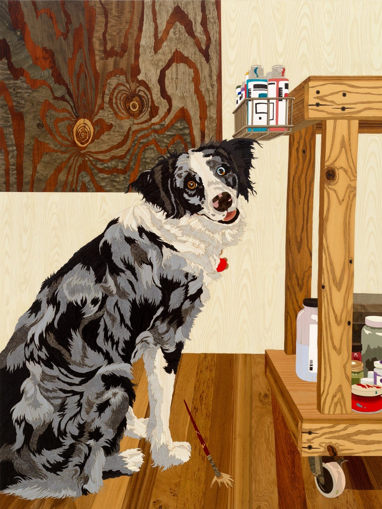 Alison Elizabeth Taylor, “A Cat Person’s Studio Dog” (2024), marquetry hybrid on panel, 56 x 42 inches