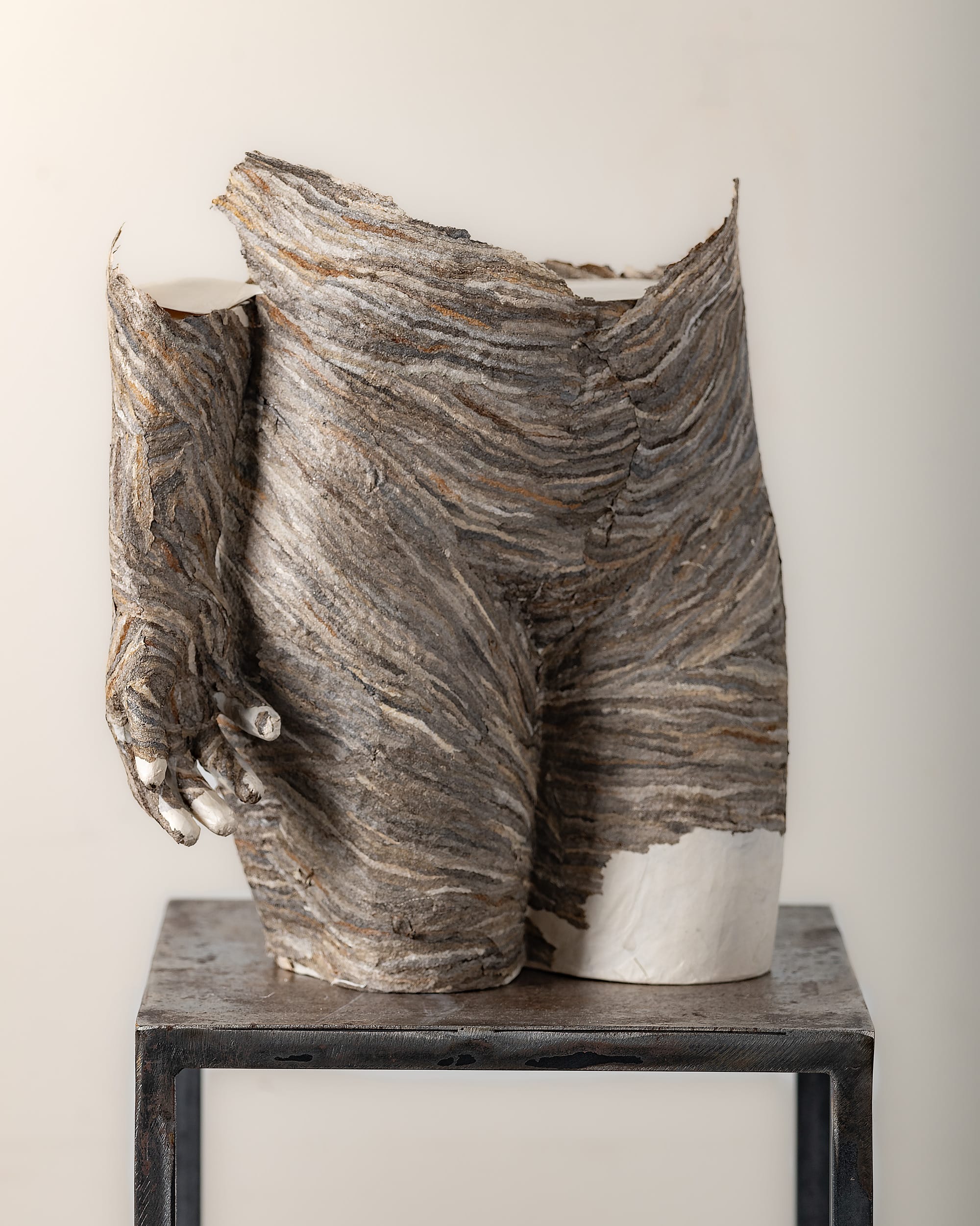 “Venus” (2024), paper, wasp nest, and wood, 68 x 12.50 x 11 inches