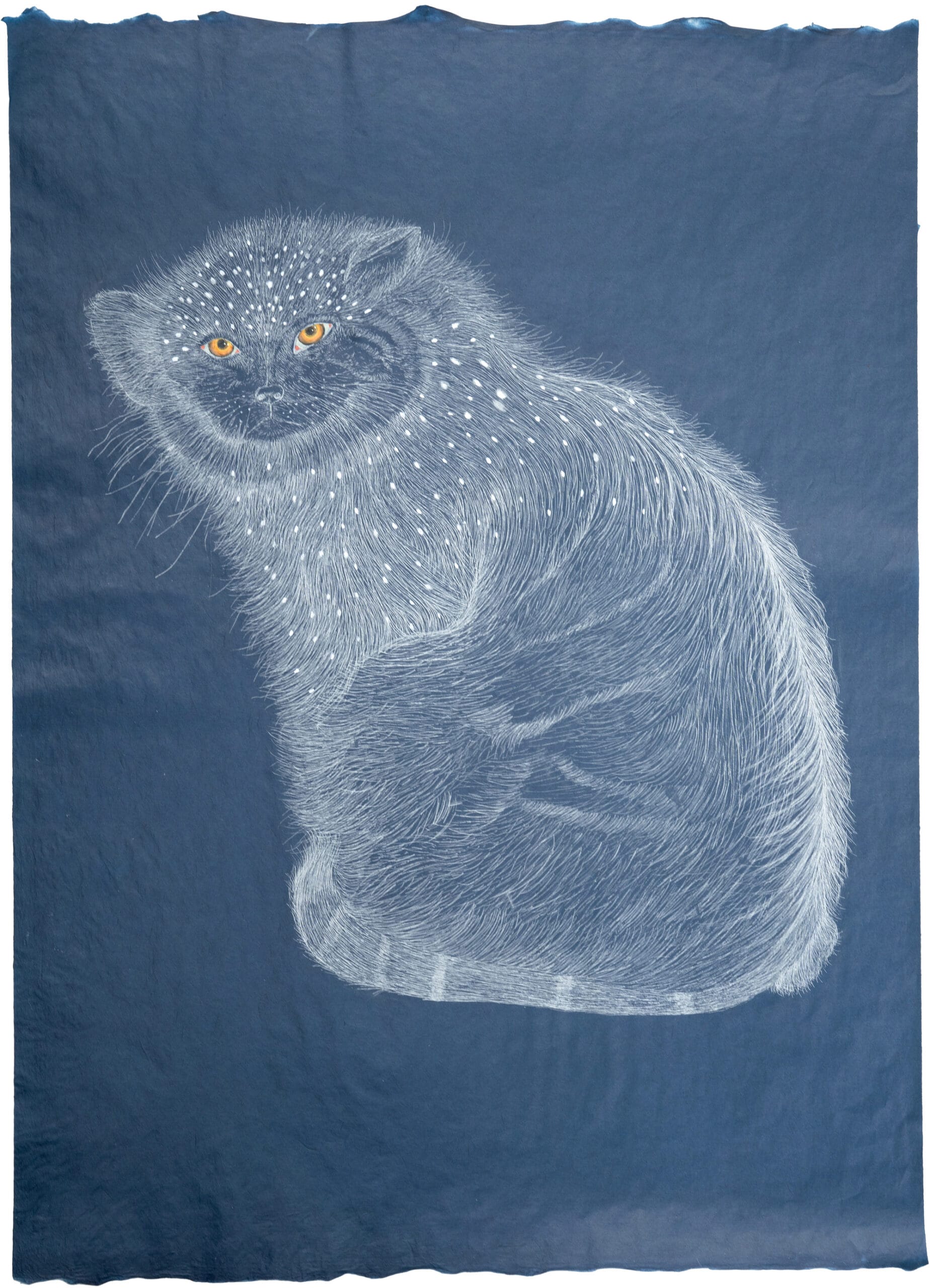 “Cat” (2024), ink and watercolor on handmade indigo paper, 18.5 x 25.5 inches