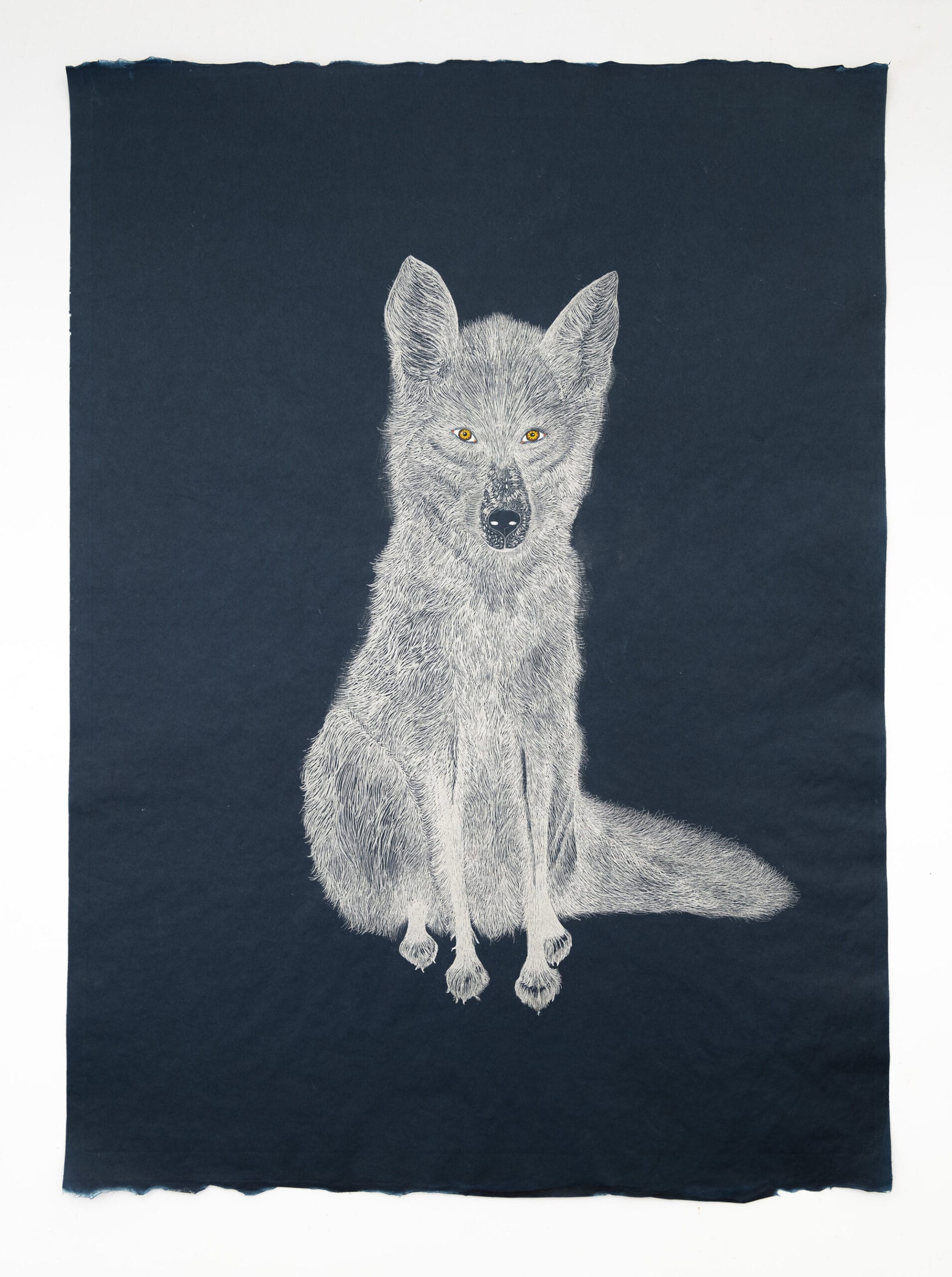 “Fox” (2024), ink and watercolor on handmade indigo paper, 2024, 18.5 x 25.5 inches