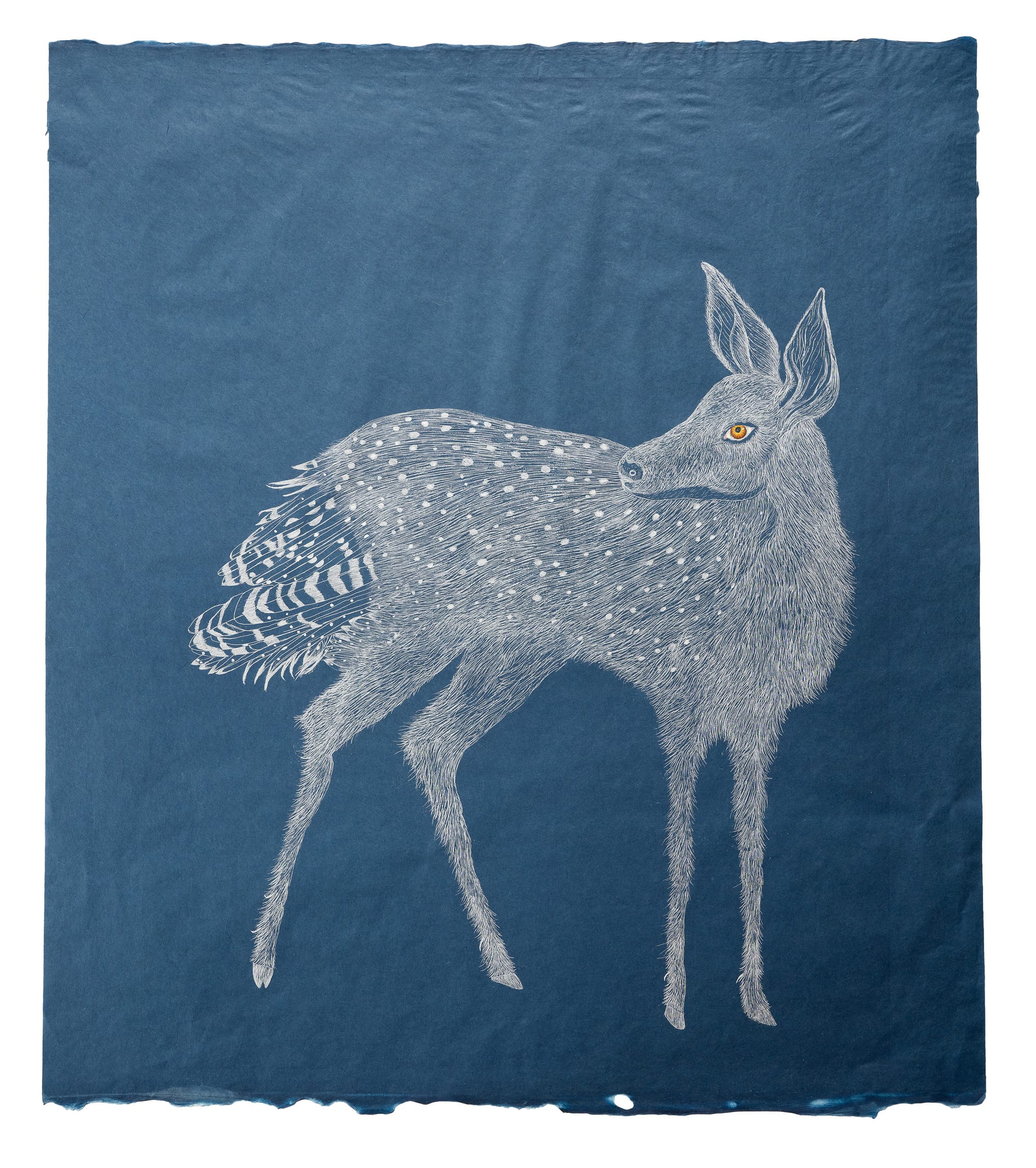 “Deer with feathers” (2024), ink and watercolor on handmade indigo paper, 25.5 x 27 inches. All images © Valerie Hammond, shared with permission