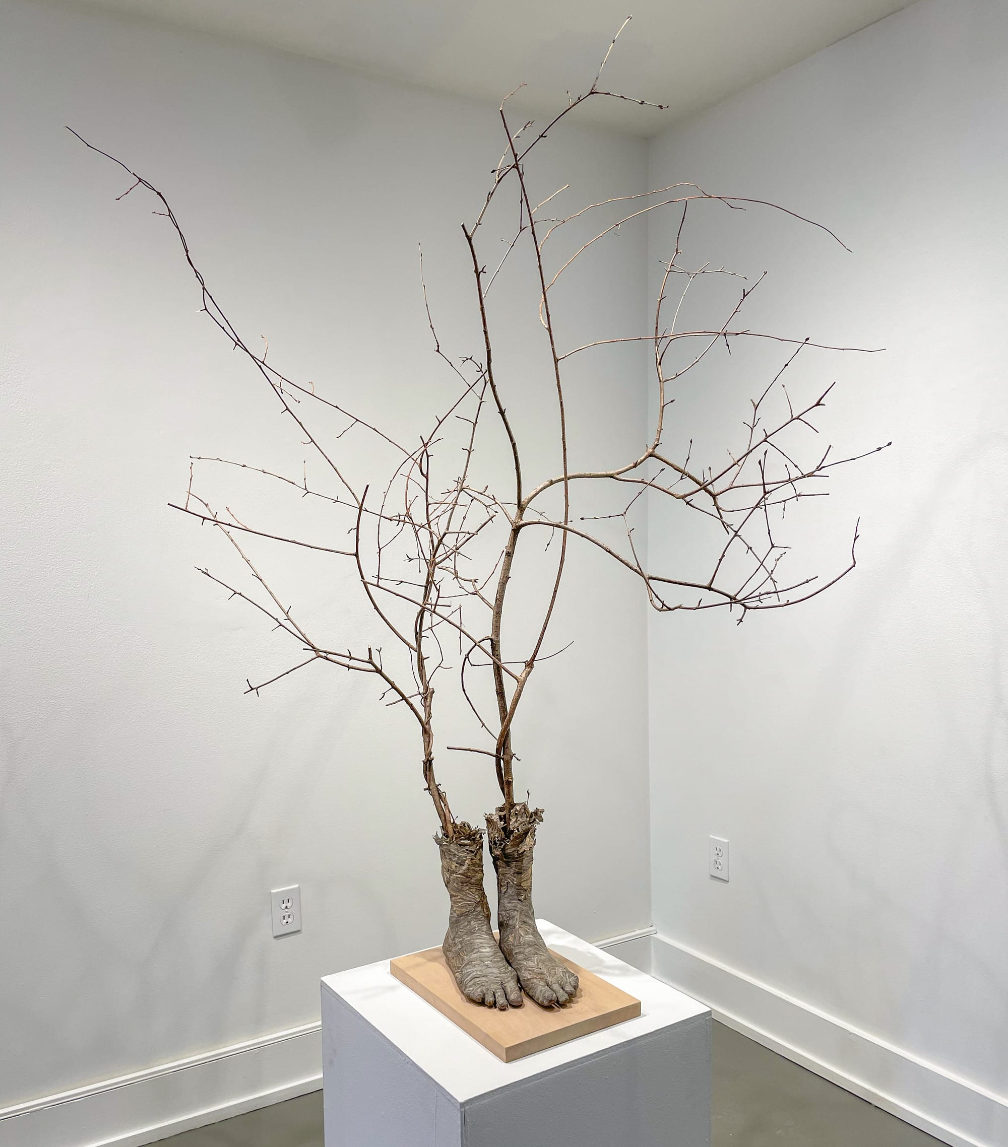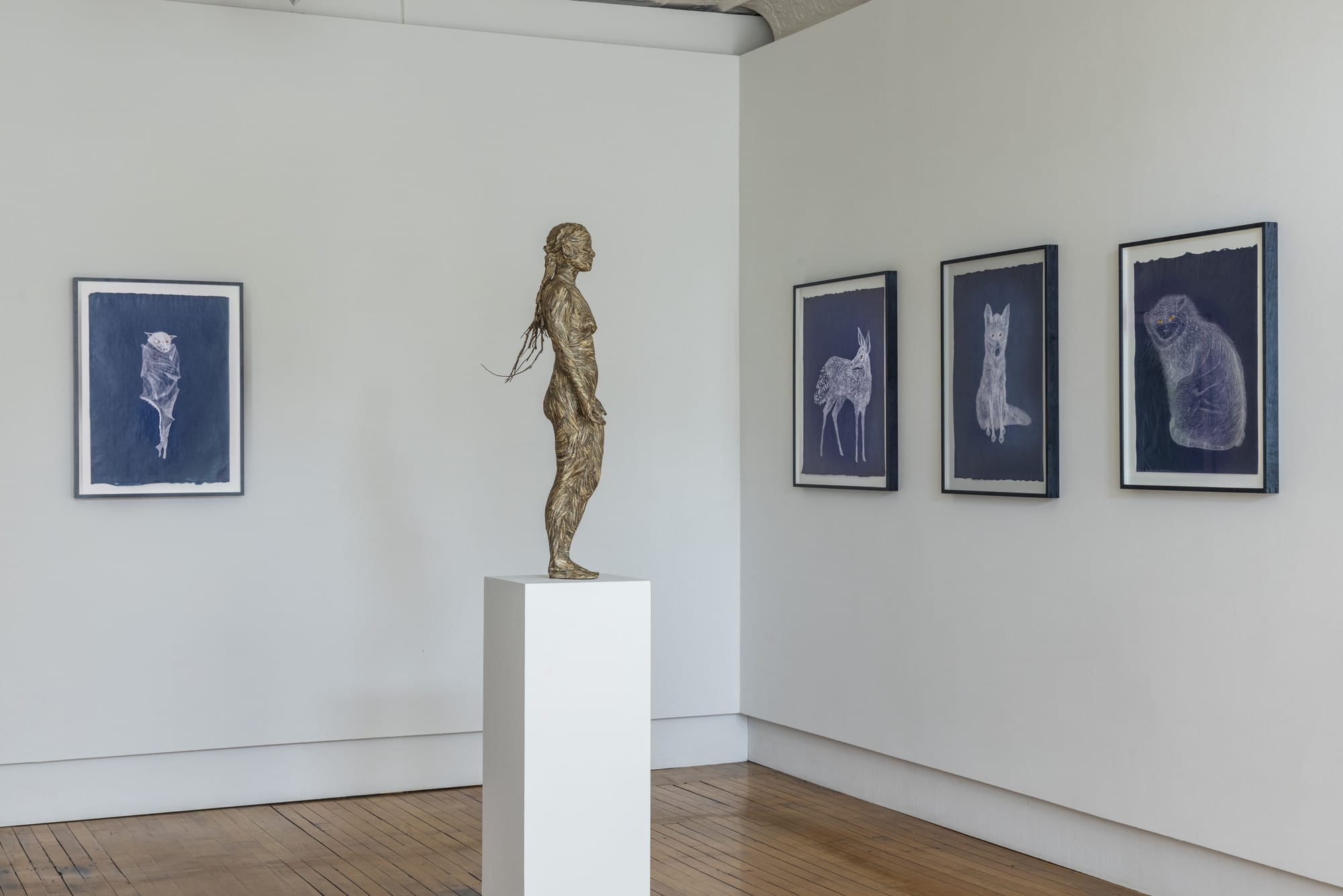 A feminine figure with billowing texture emerges from an amalgamation of wasp nests, wood, and paper in “Daphne 2,” alluding to the mythological tale while emphasizing the inextricable parallels between feminine plight and the metamorphic characteristics of nature. “Laurel” quite literally depicts the cost of self-advocacy, portraying Daphne’s fate as sprawling tree branches ascend from a pair of feet. Hammond’s ink pieces further draw upon the dissolution of feminine bodies, as inked silhouettes fade into landscapes behind them.