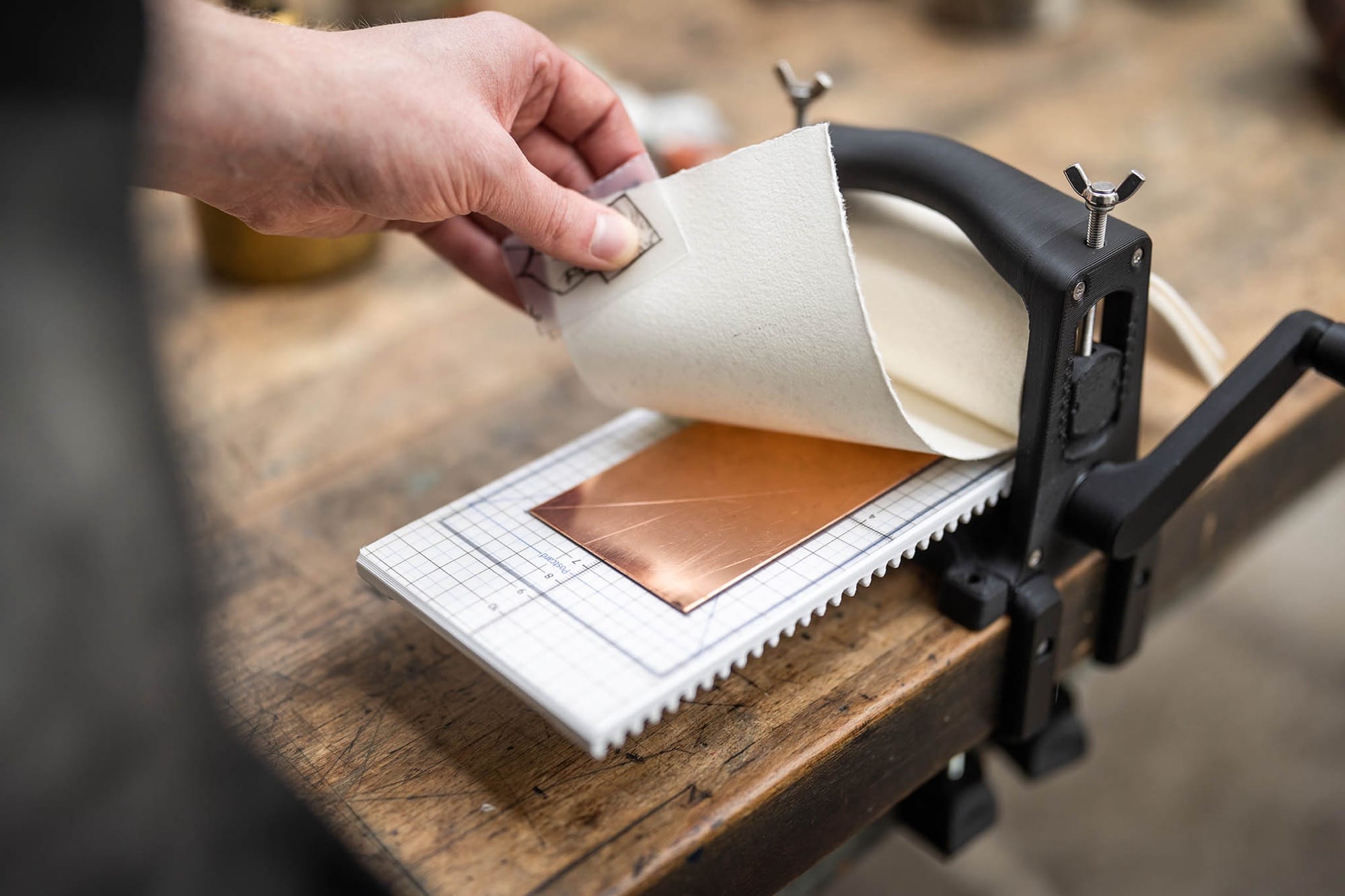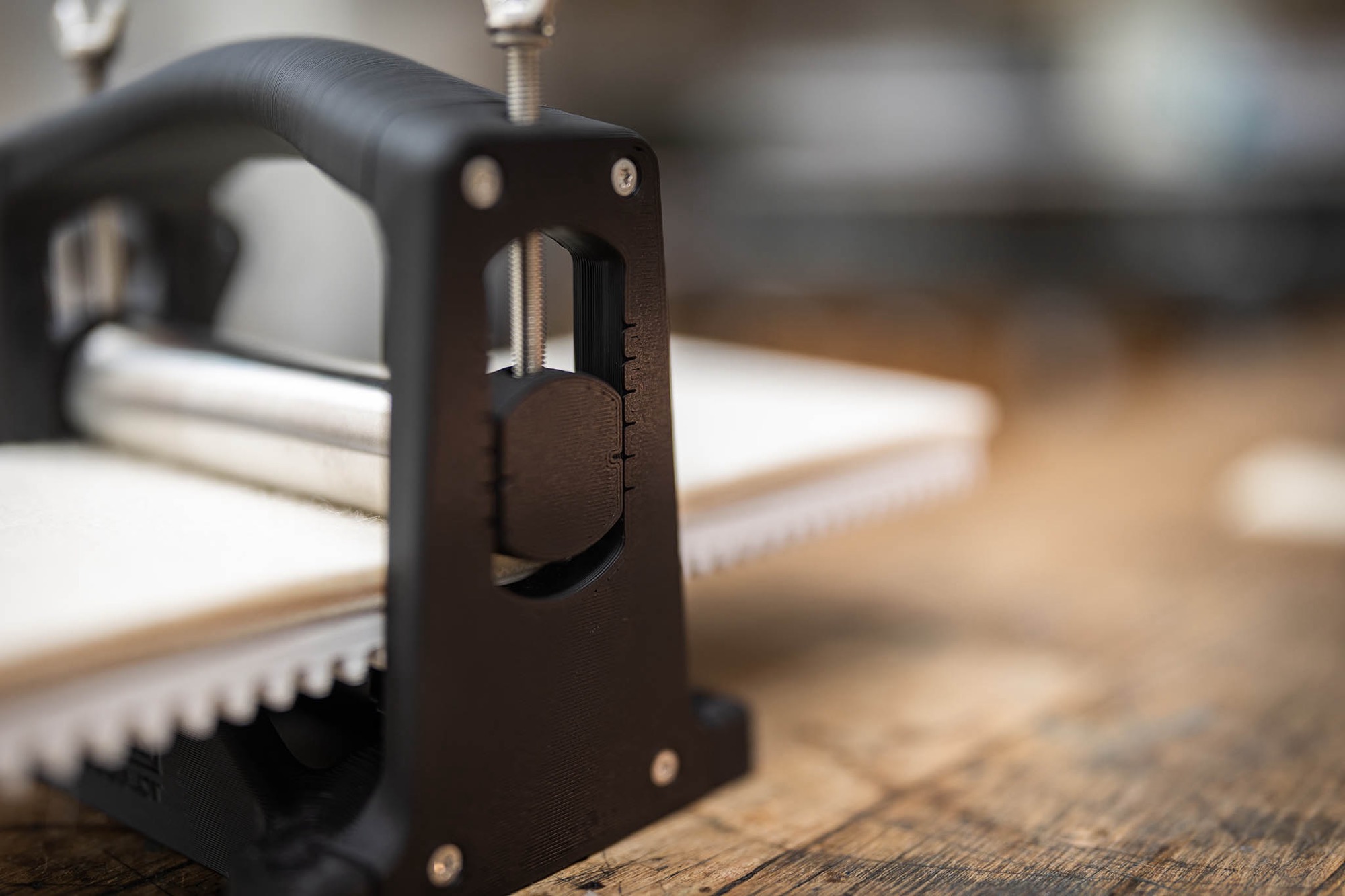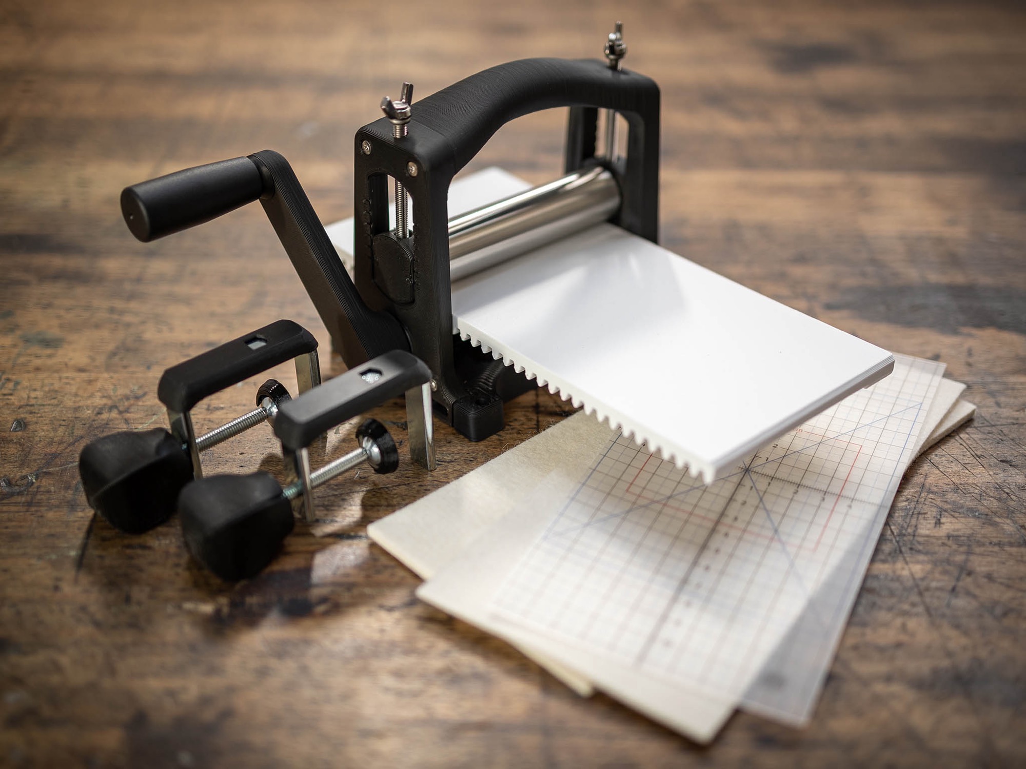As its name suggests, the 3D-printed, tabletop device is designed for paper about 4 x 9 inches wide and is capable of all types of intaglio printing, from etching and engraving to linocuts and woodcuts. Schneider and Schmitz also upgraded the metal components from previous iterations to make at-home printmaking a little easier.