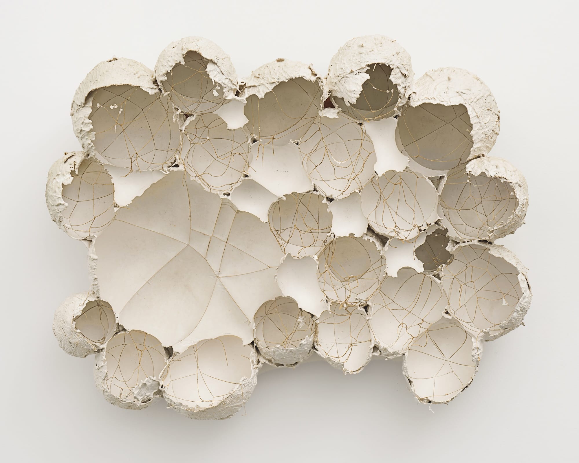 Mária Bartuszová, “Untitled” (1985), plaster and string, 41 3/8 × 52 3/4 × 15 3/8 inches. Photo by Michael Brzezinski, courtesy of The Estate of Maria Bartuszová, Košice, and Alison Jacques, London