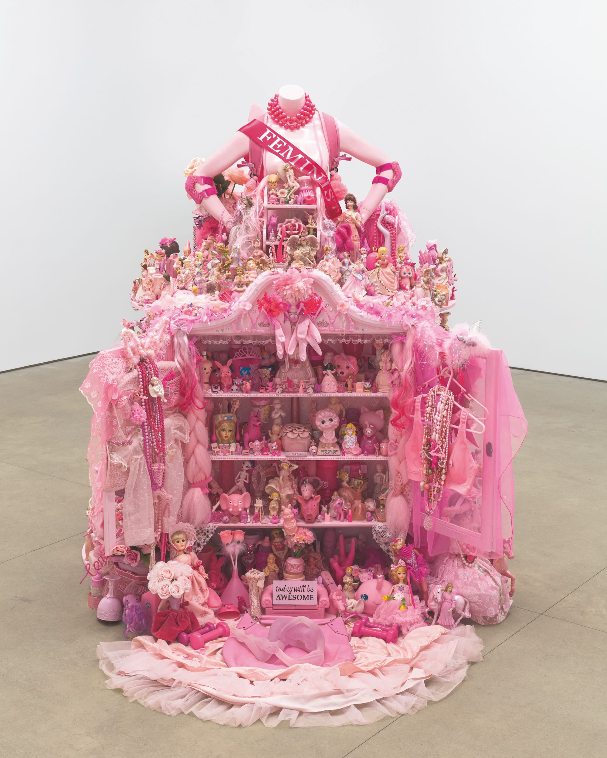 Portia Munson, “Today Will Be Awesome” (2022), found pink objects, pink synthetic fabric and cloths, mannequin, salvaged round bar table, and deconstructed secretary desk/cabinet, 72 × 60 × 70 inches. Photo by JSP Art Photography, courtesy of P·P·O·W, New York. All images © the artists, courtesy of Phaidon, shared with permission