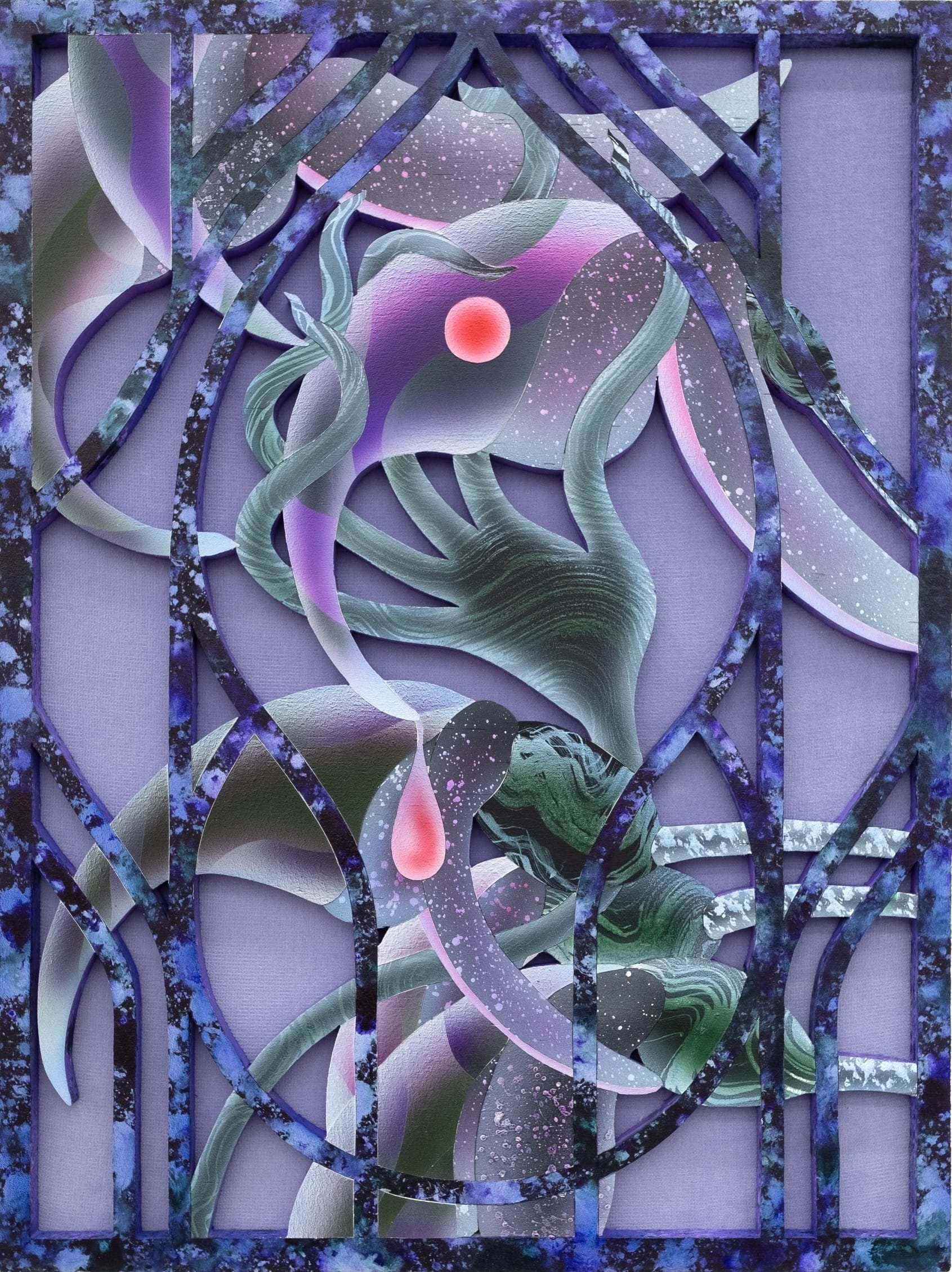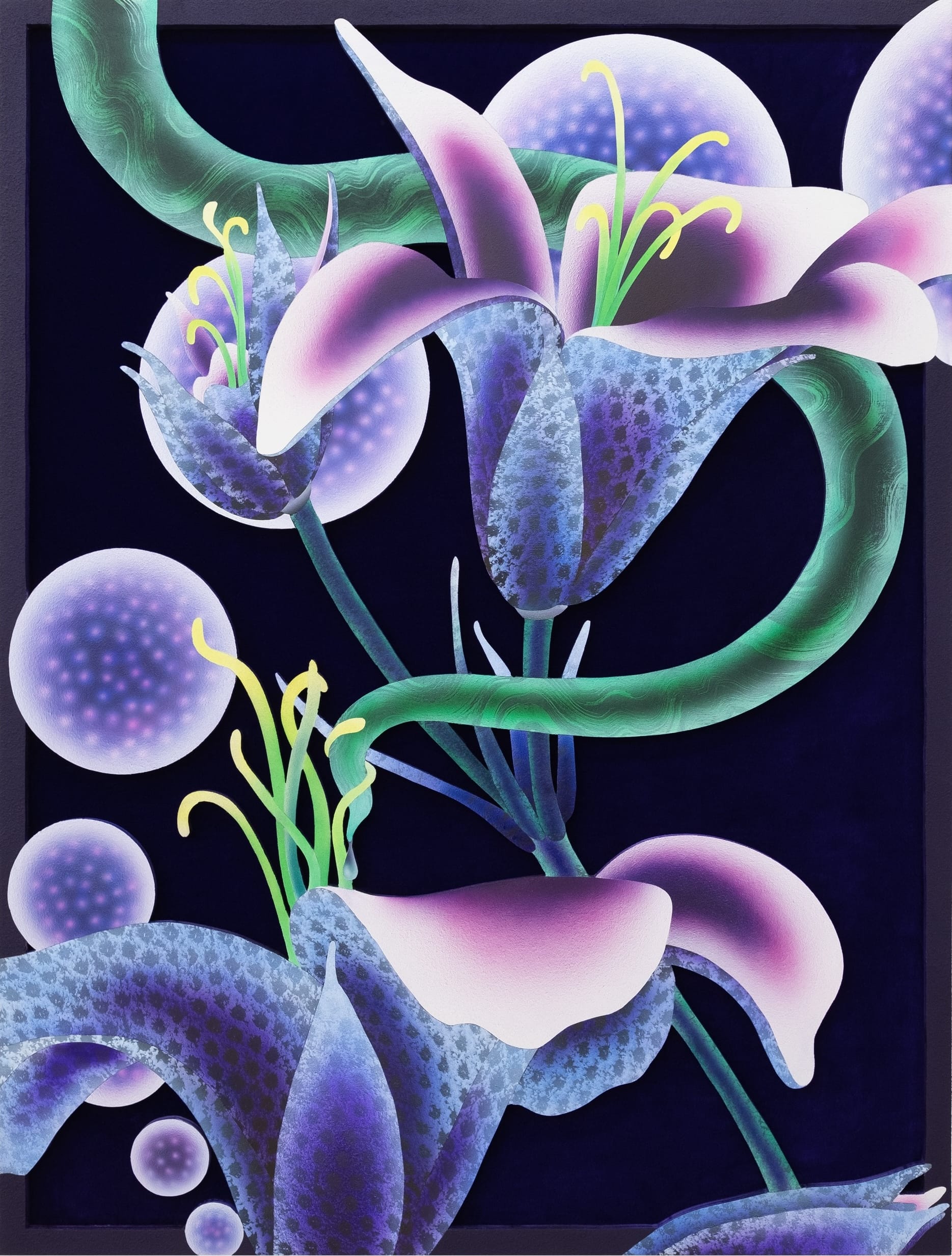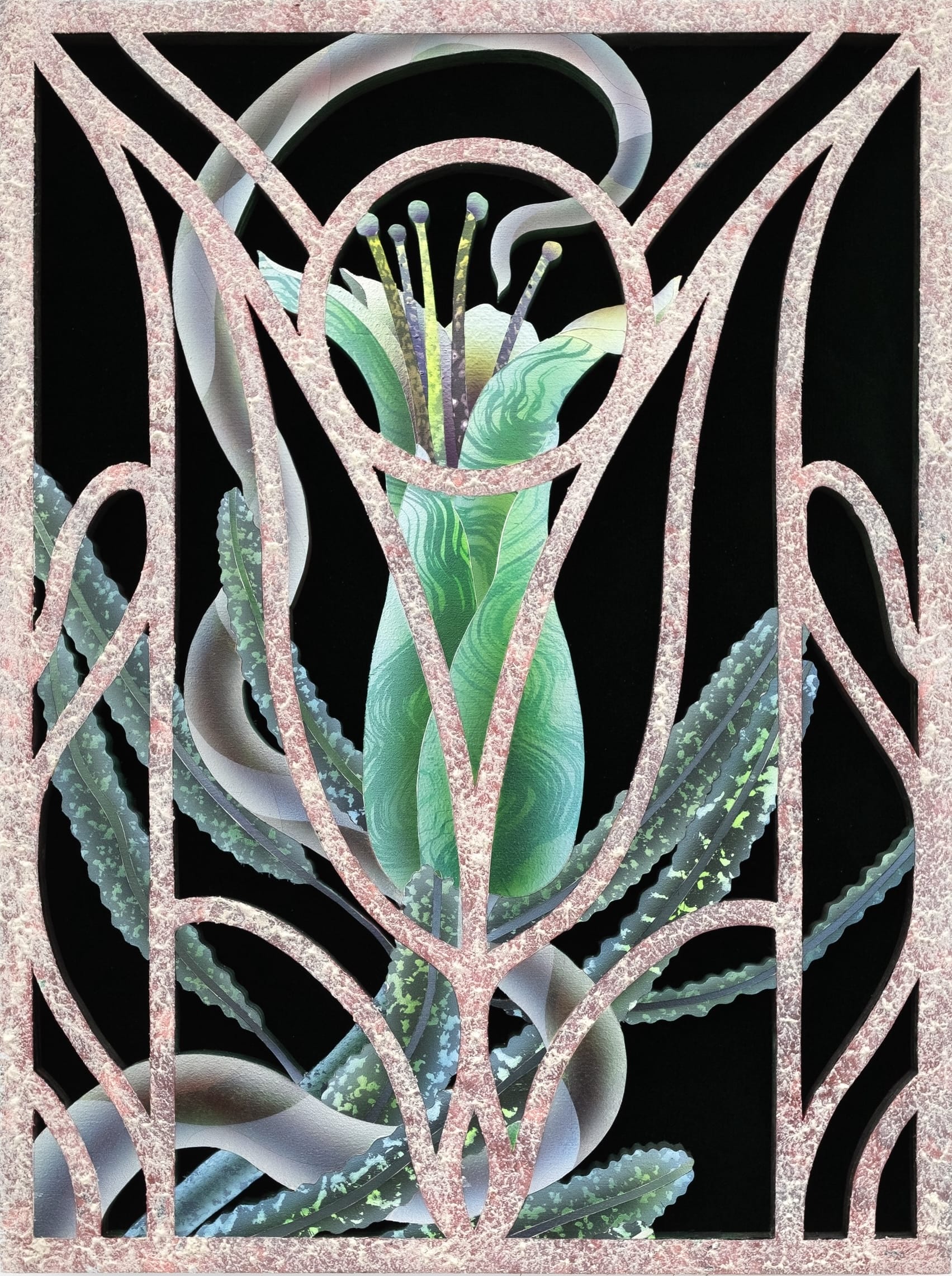 Mevlana Lipp redefines the genre by meticulously rendering otherworldly botanicals that writhe and spread amid ornamental elements. Acrylic paint, sand, and ink are applied to meticulously cut wooden panels, which are then laid over the top of velvet. Fantastical and glowing as if viewed under a black light or synthesized, the blooms and vines suggest an alternate reality in which plants take on suspiciously human behaviors or features, like hands or eyes.