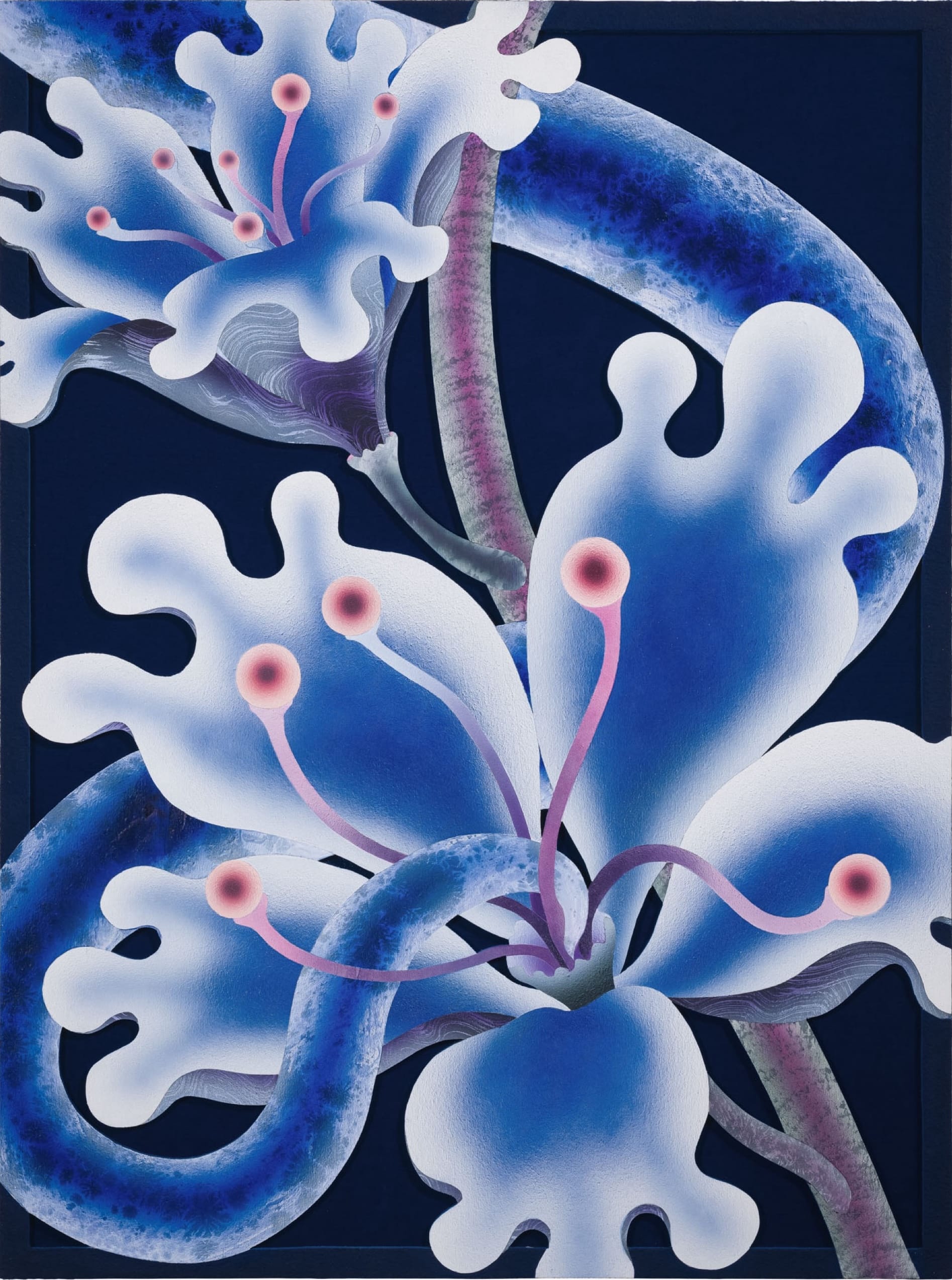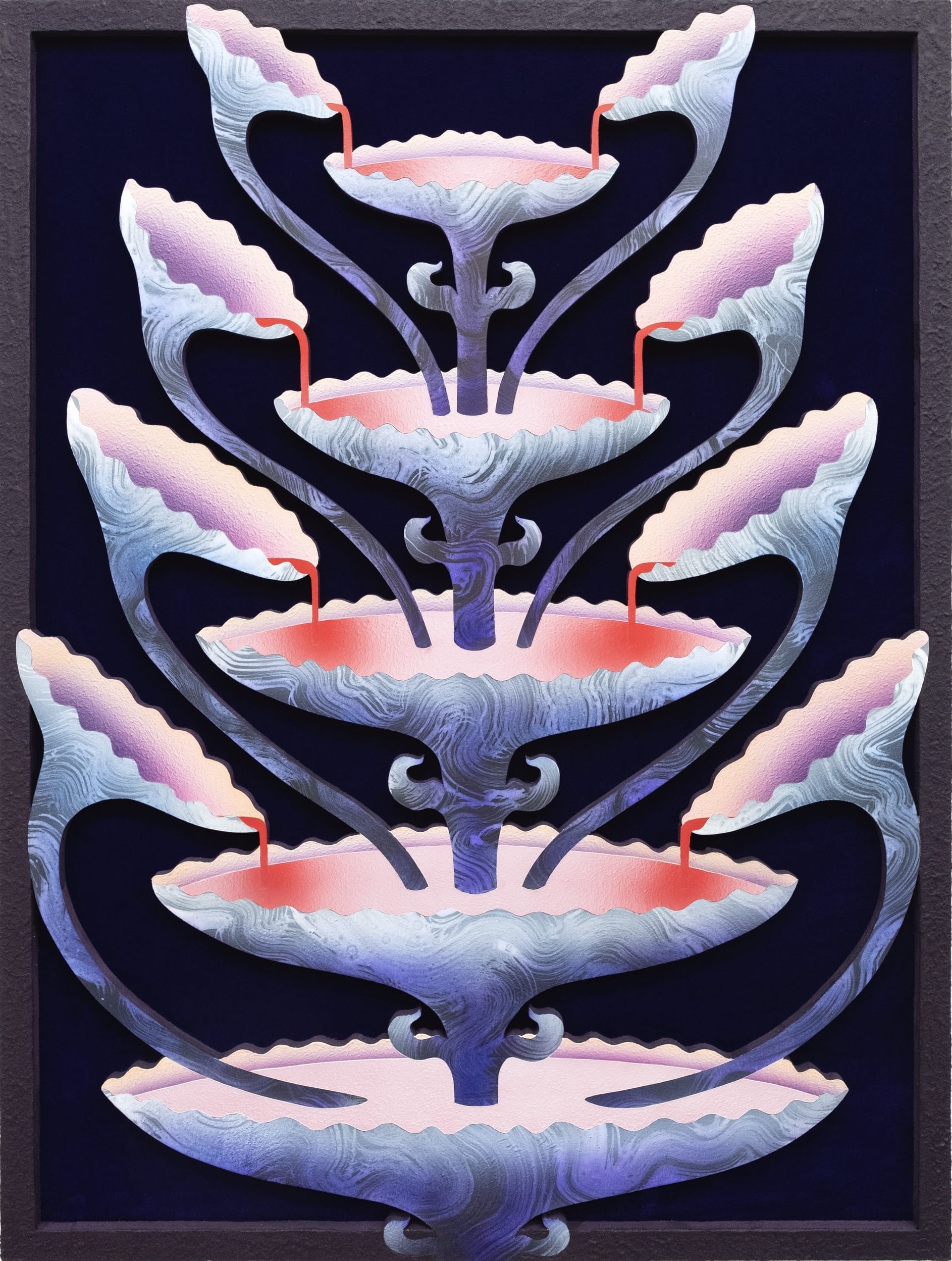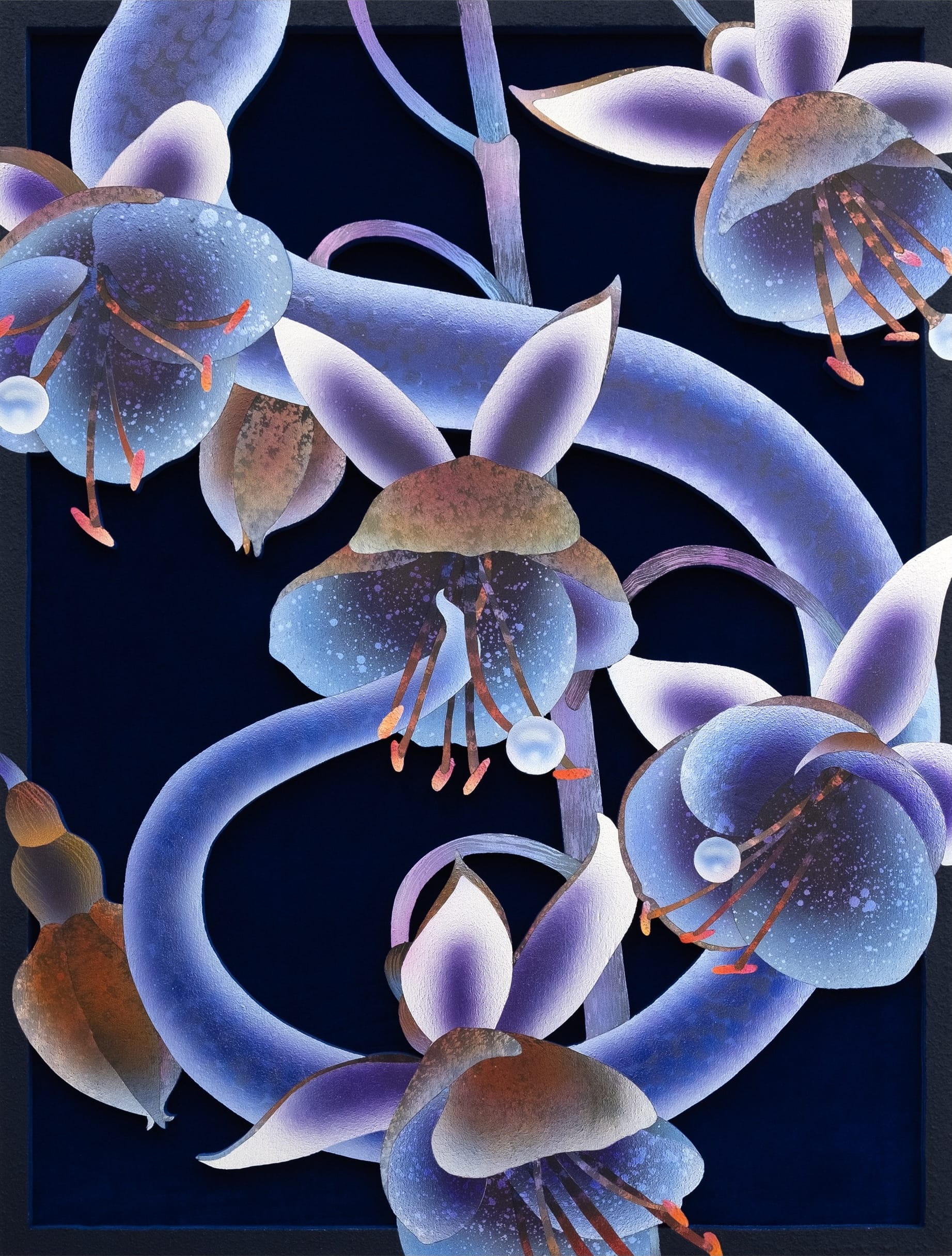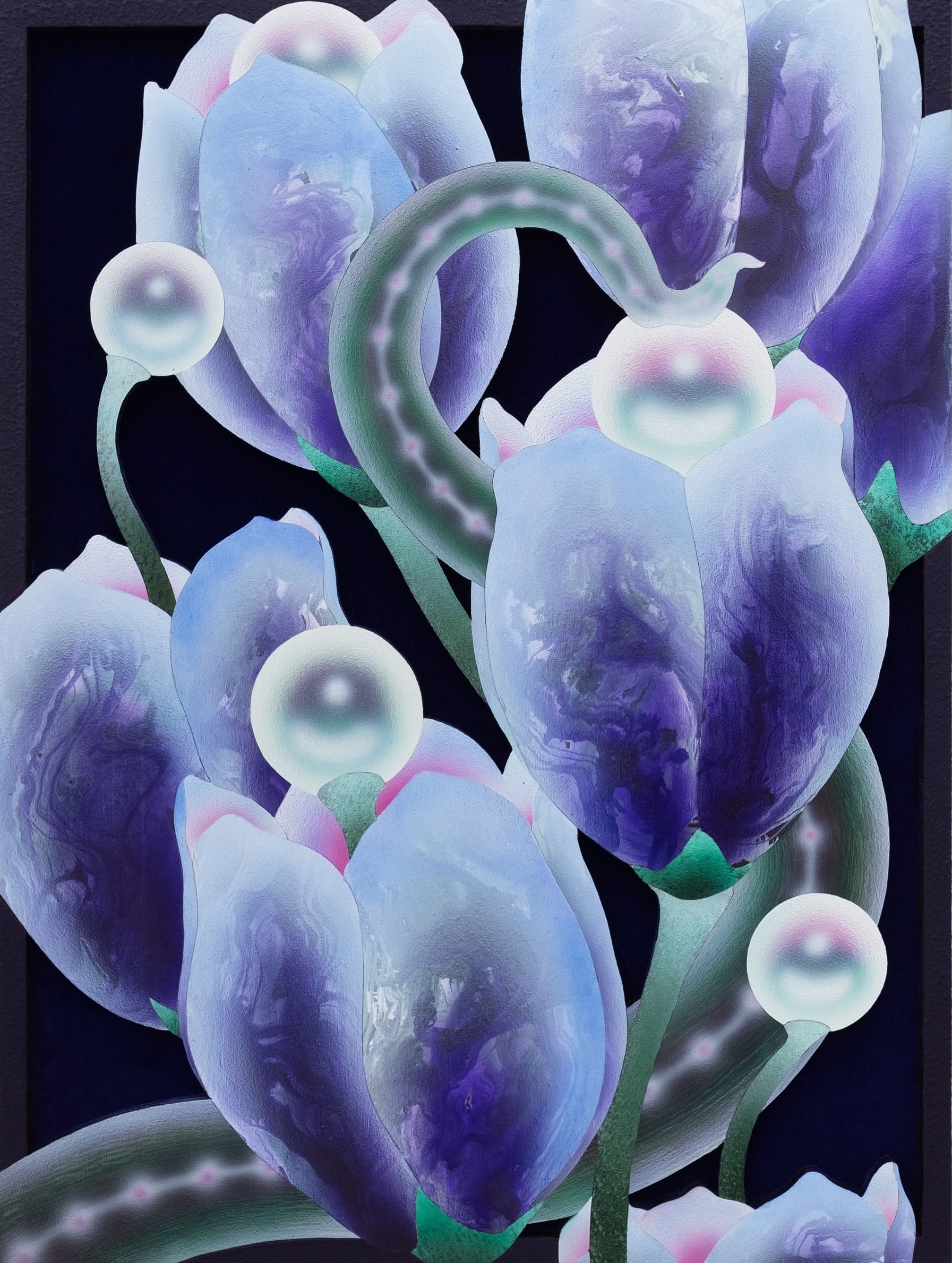 Mevlana Lipp redefines the genre by meticulously rendering otherworldly botanicals that writhe and spread amid ornamental elements. Acrylic paint, sand, and ink are applied to meticulously cut wooden panels, which are then laid over the top of velvet. Fantastical and glowing as if viewed under a black light or synthesized, the blooms and vines suggest an alternate reality in which plants take on suspiciously human behaviors or features, like hands or eyes.