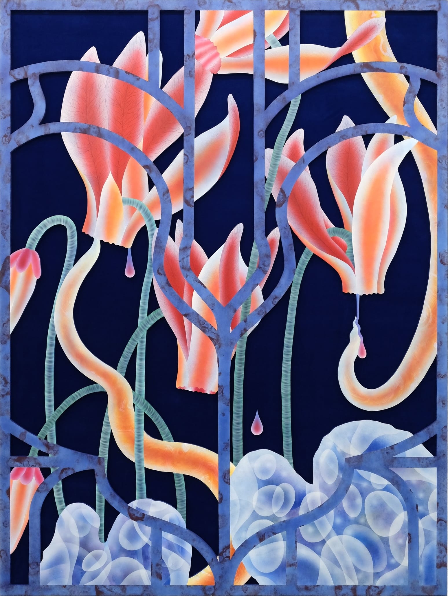 “My work always has to do with longing for this other place, where things are still connected on a deeper level, where thoughts don’t occur and instincts take over,” Lipp tells Colossal. Interested in the relationship between order and chaos, he often uses symmetry or repetition as a foil to the organic curves of his subjects. In his most recent work, the artist has been experimenting with the theme of a grid or gate.