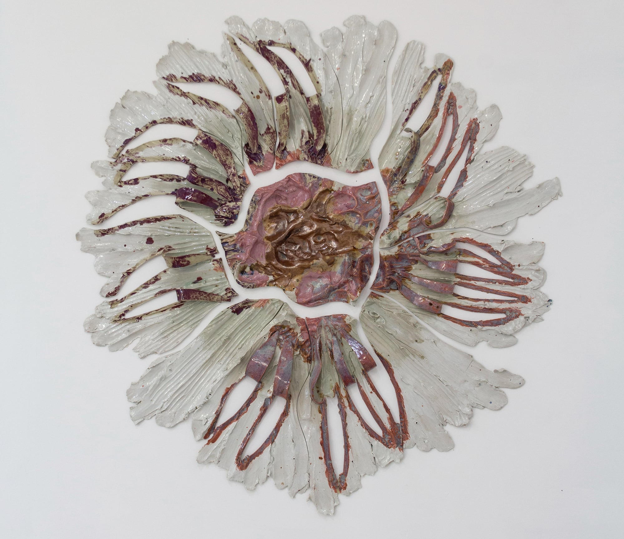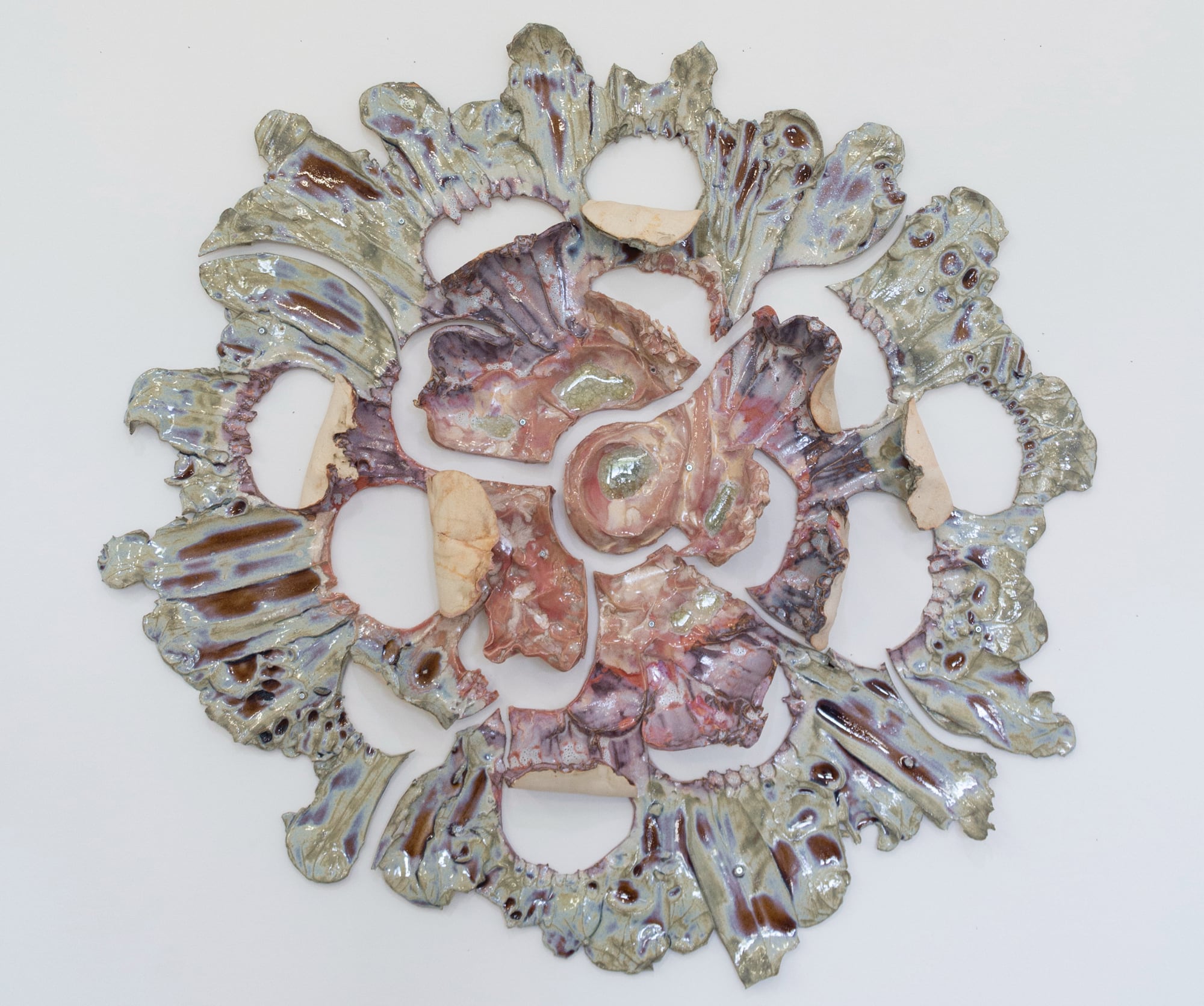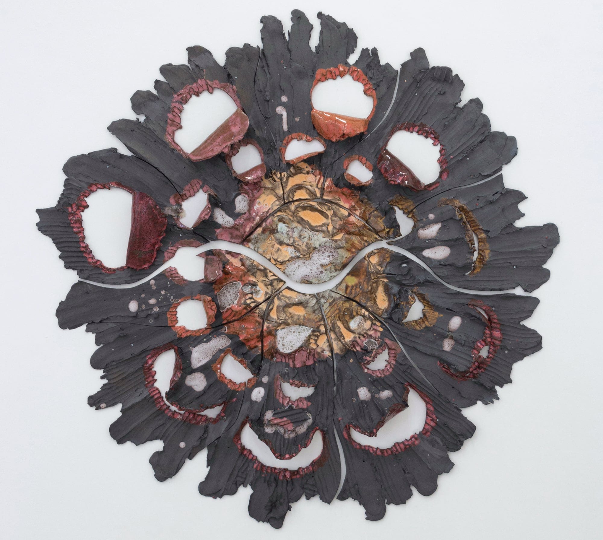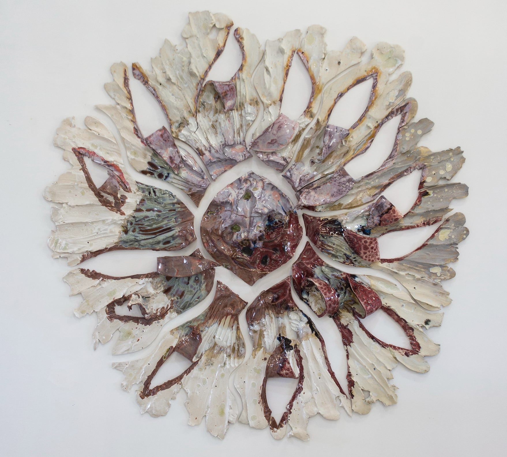 “Petaling Inward, Slicing Outward, 130lbs” (2024), glazed stoneware and hardware, 69 1/2 x 68 x 4 inches