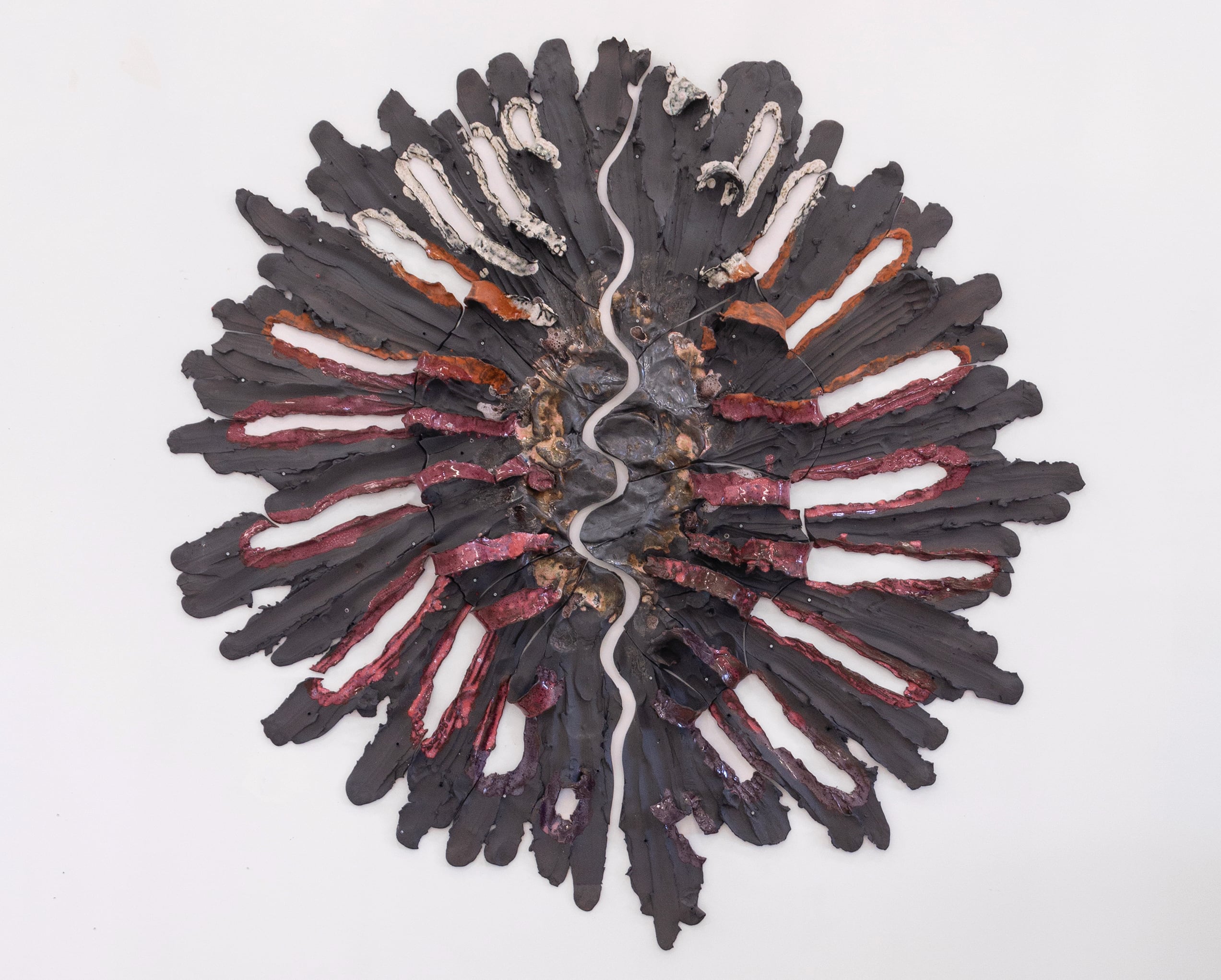 “Exposing from Center, 130lbs” (2024), glazed stoneware and hardware, 84 x 80 1/2 x 5 inches