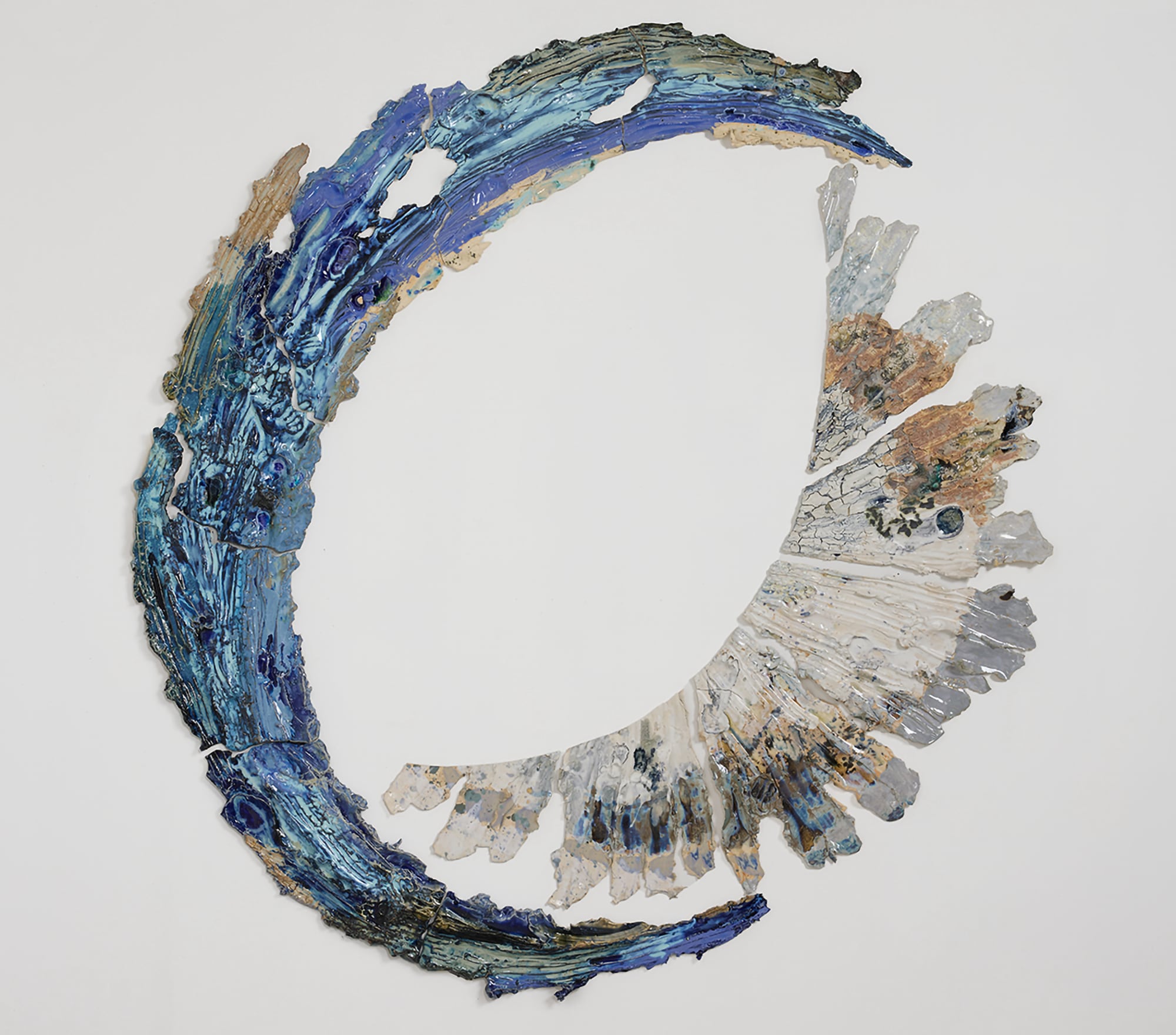 “Holding the Space Between Two Waves, High Tide (130lbs Cut from Low Tide)” (2024), glazed stoneware and hardware, 77 1/2 x 71 1/2 x 2 3/4 inches