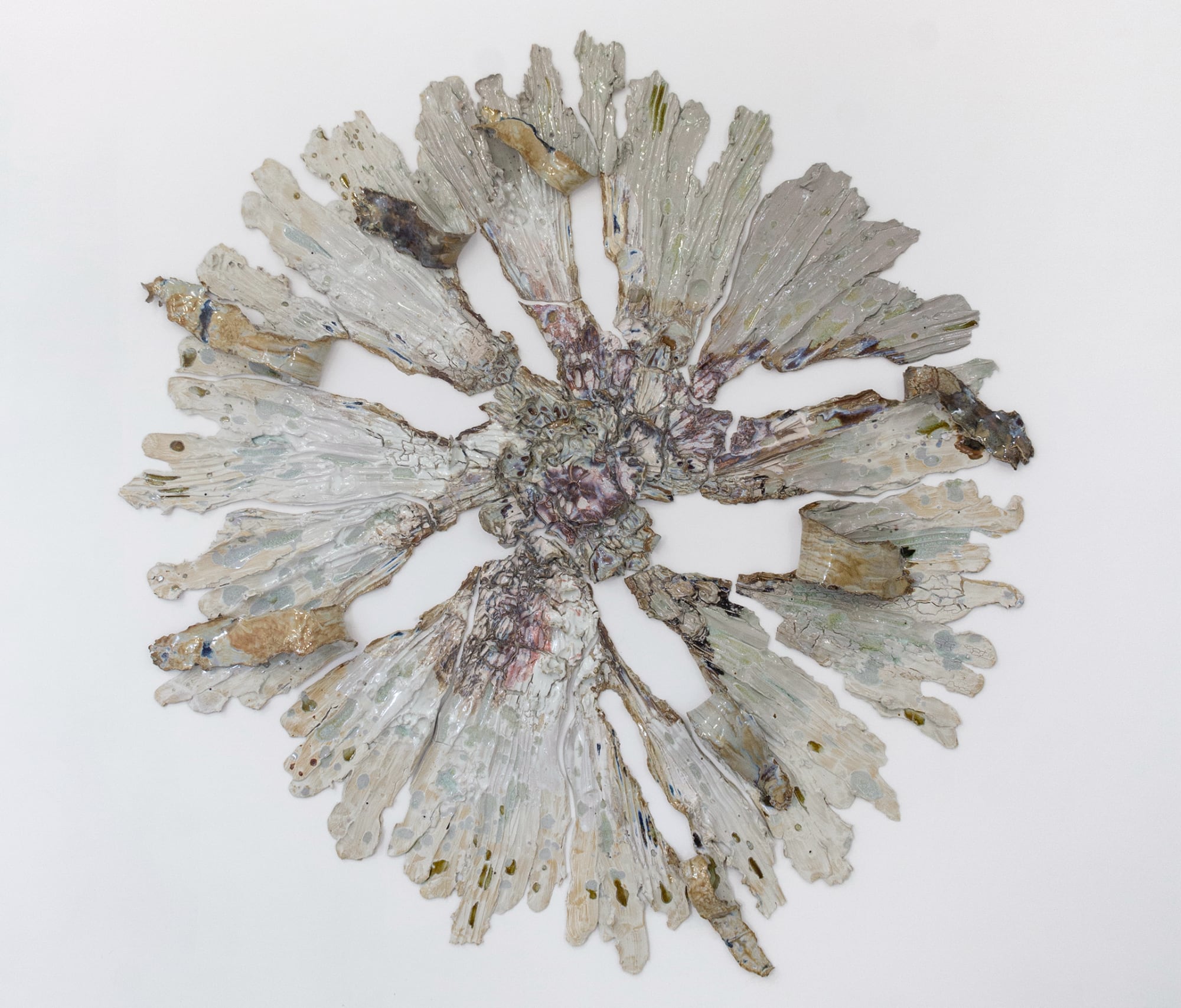 Beginning with 130 pounds of soft clay, Brie Ruais sculpts radial forms that capture her body’s movement and proportions. The amount of material aligns with the artist’s weight, which she heaves from a central point to create the appearance of bursting outward. Each textured wall work freezes an imprint of her body, while glazes in deep charcoal, blue, beige, and rose conjure the elements of earth, water, air, and fire.