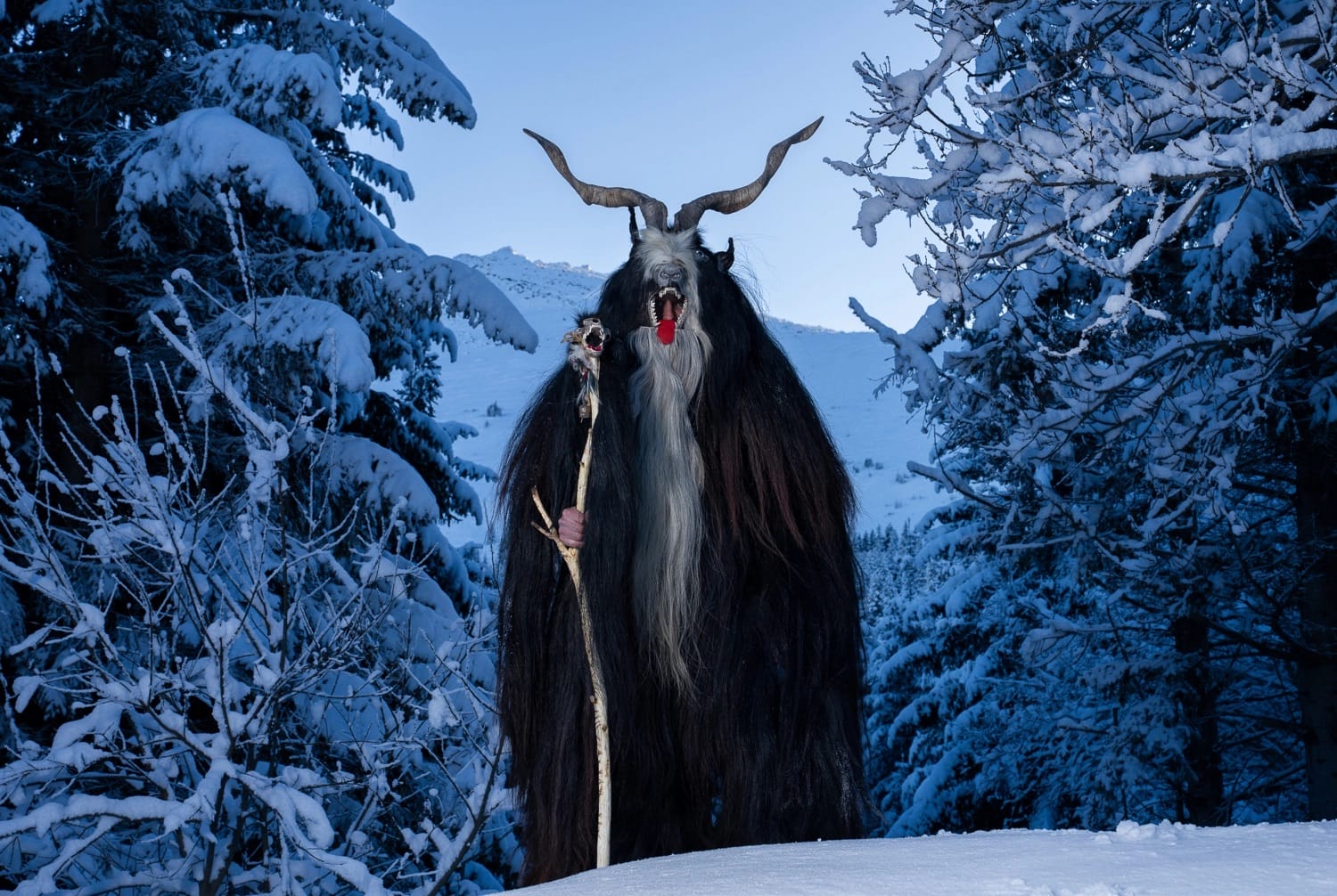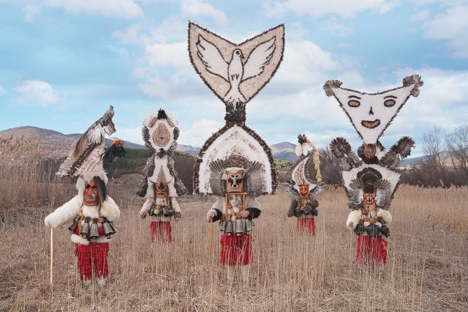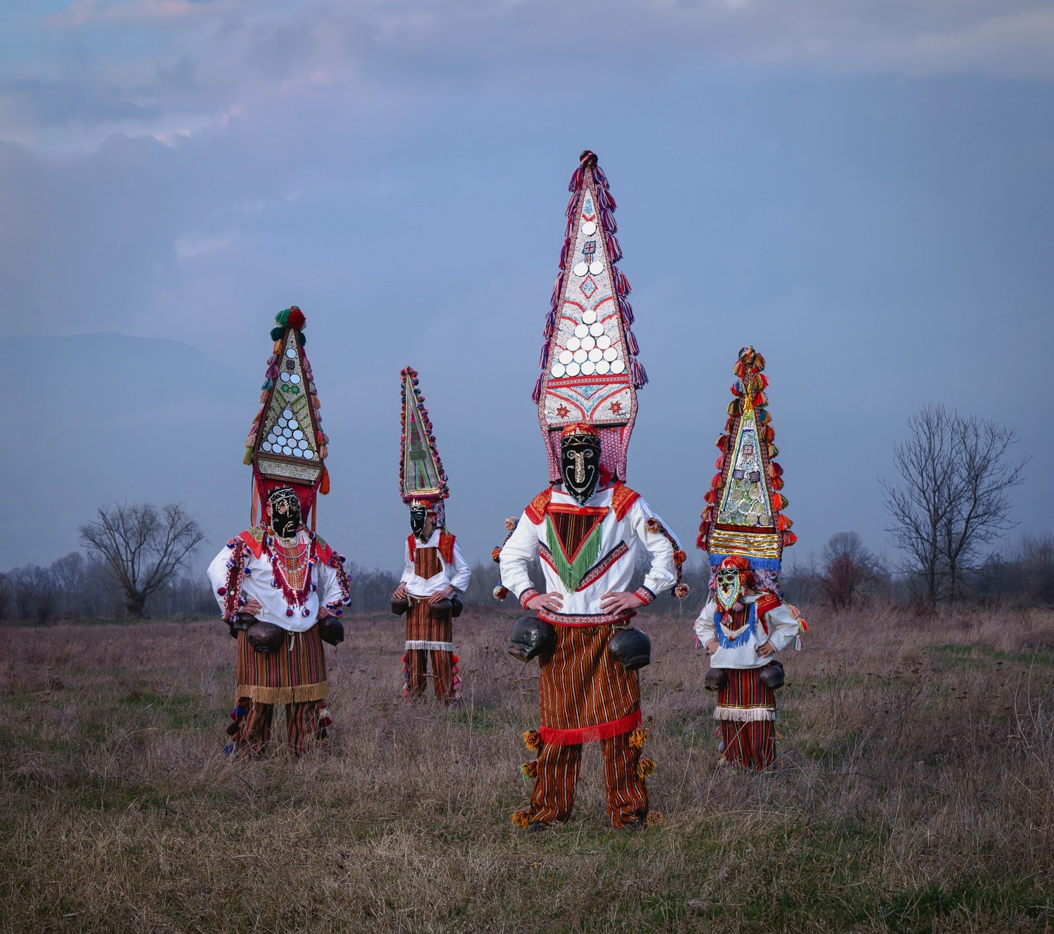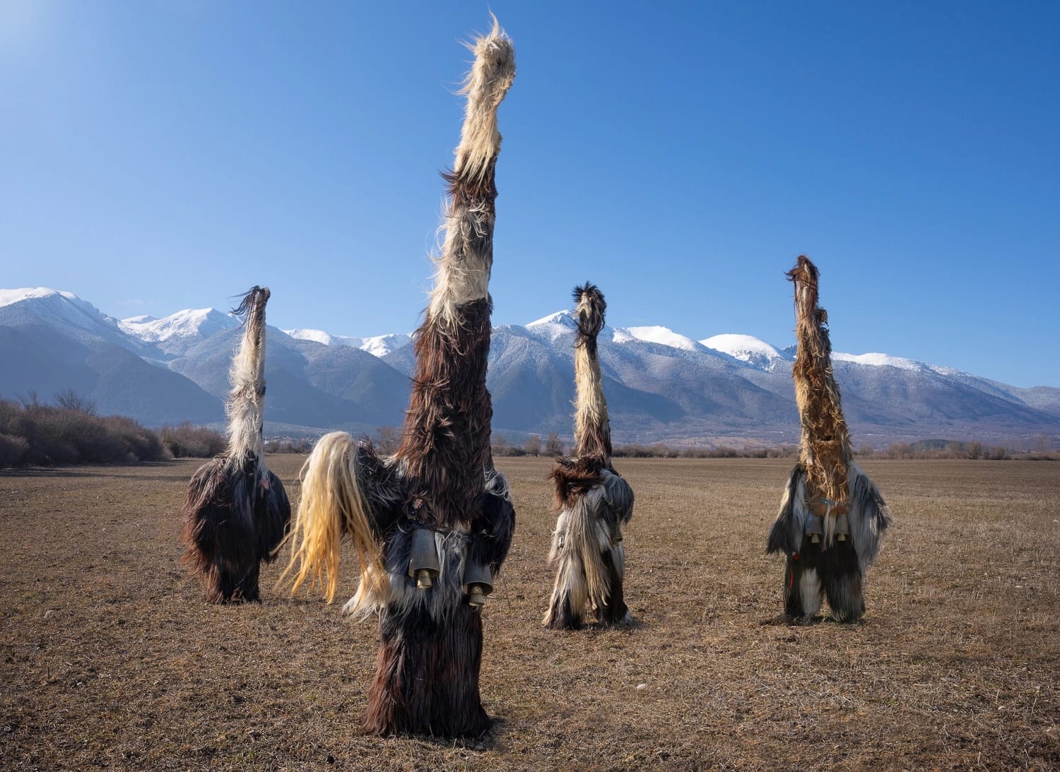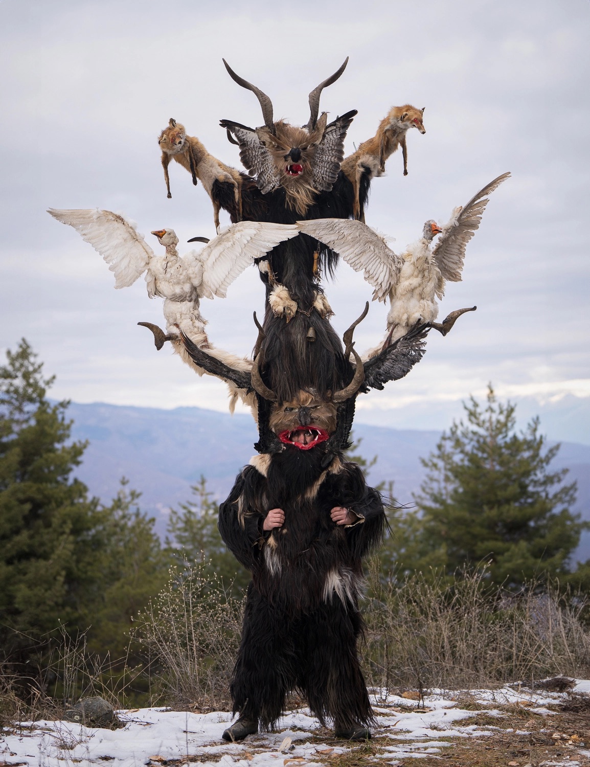 Some of the characters Suszczynski meets in her ongoing travels include the Bulgarian Kukeri, variations on which may be called Startsi or Chaushi, among others. Elaborate headdresses and costumes made from wool, animal horns, embroidered fabric, bells, and other ornaments invoke the mystical power to usher in new seasons and scare away evil spirits.