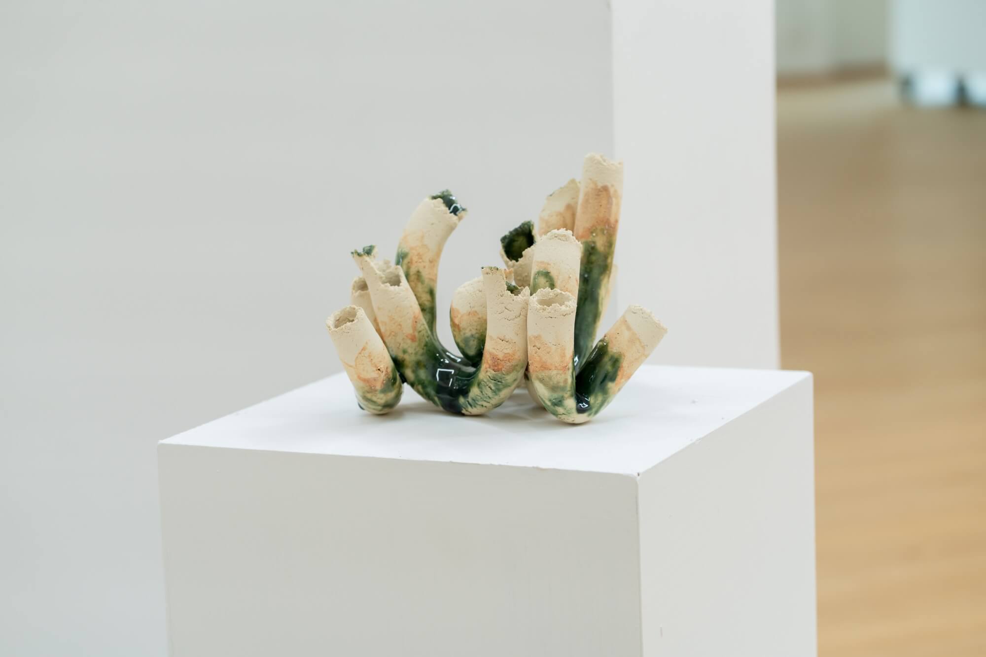 此次展出的「聲譜」系列,以 2018 年於橫濱的水下錄音創作計畫為起點,展出約二十餘件取材自不同水域聲音與土壤的雕塑與畫作。《湄南》延續這項創作脈絡,也展現蔡坤霖在材質上的轉變。相較於過去以 PVC 水管構築的工業裝置,此次他以陶土為主要媒介,並在錄音現場取土混入陶土中,讓土地的氣息與聲音的軌跡共存。土、水、火交融的過程,使每件作品皆帶有環境的痕跡與不可控的變化,形成如同聲音回響般的肌理。陶土成為「聲音的共鳴體」,承載著時間、記憶與地理的能量。這些雕塑因此帶有土地的氣味,也帶有聲音的痕跡。不同土質在高溫燒成後,與釉藥產生意想不到的化學變化,形成獨一無二的色彩。