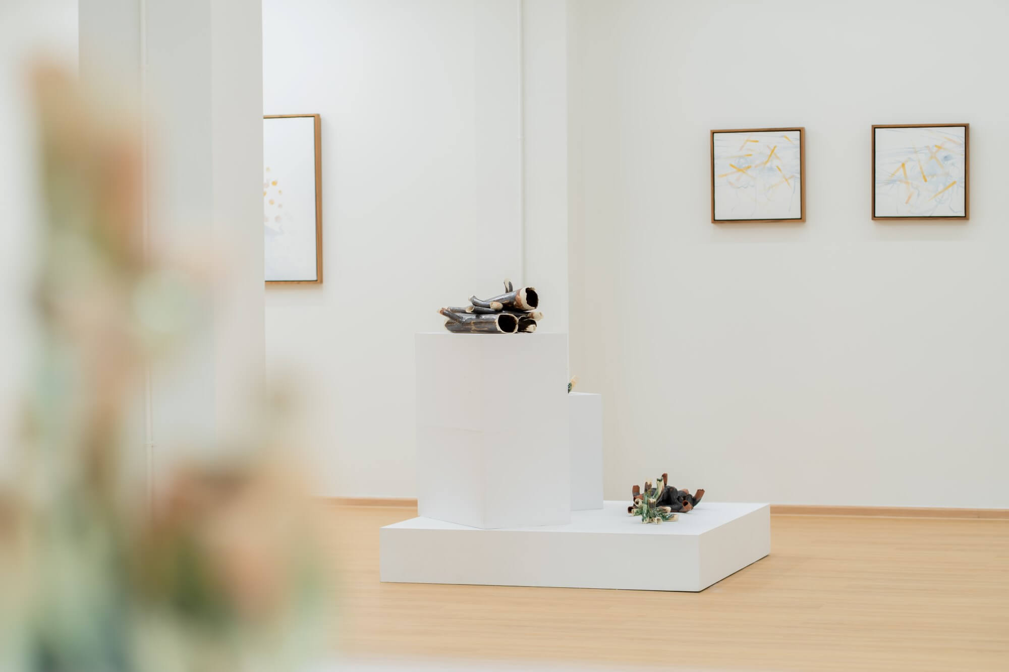 在這次的展覽中,聲音不以再現的形式播放,而是幻化為雕塑和繪畫的形式凝固呈現。蔡坤霖將這類型的作品以「聲譜」稱之——不同於傳統樂譜,它們以造形與顏色記錄聲音節奏的視覺譜面。藝術家以速寫的方式記錄回放錄音的聽覺印象,再以陶土將線條立體化,每件陶塑皆混合當地土壤,形成獨特質地與色彩。繪畫亦延伸此概念來描繪水下聲音的節奏與空間變化,讓觀眾能「看見」聲音。
