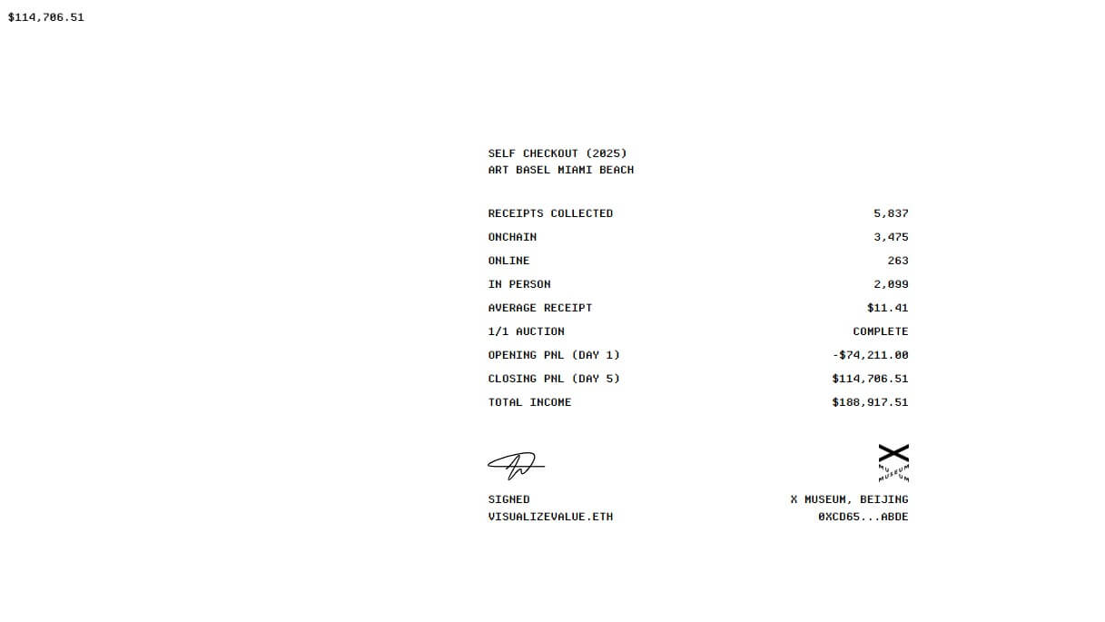 然而,《Self Checkout》並不只停留在概念層面。每張收據底部還附上一組金鑰,可生成一個區塊鏈上的專屬錢包,用於存放該收據的數位副本。這個 NFT 是不可轉讓(Non-transferable),它並非用來投機或買賣,而是做為「參與行為」的鏈上見證。藝術家用這件作品重新定義了 NFT:不是投資標的,而是收據,一種可被驗證、不可偽造、能永久保存的「參與證明」。鏈上紀錄與實體收據的雙重結構,使得《Self Checkout》成為具有豐富概念的藝術綜合體。