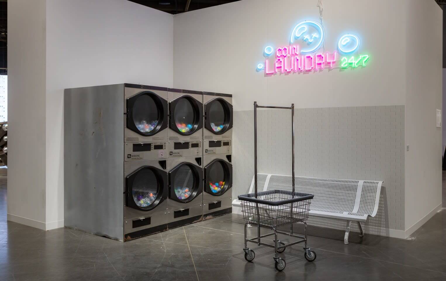 XCOPY《 Coin Laundry》,2025,客製化智慧合約、複合媒材裝置,限時版本作品,於 2025 Art Basel Miami Beach Zero 10 展區現場。圖/Art Basel 提供。