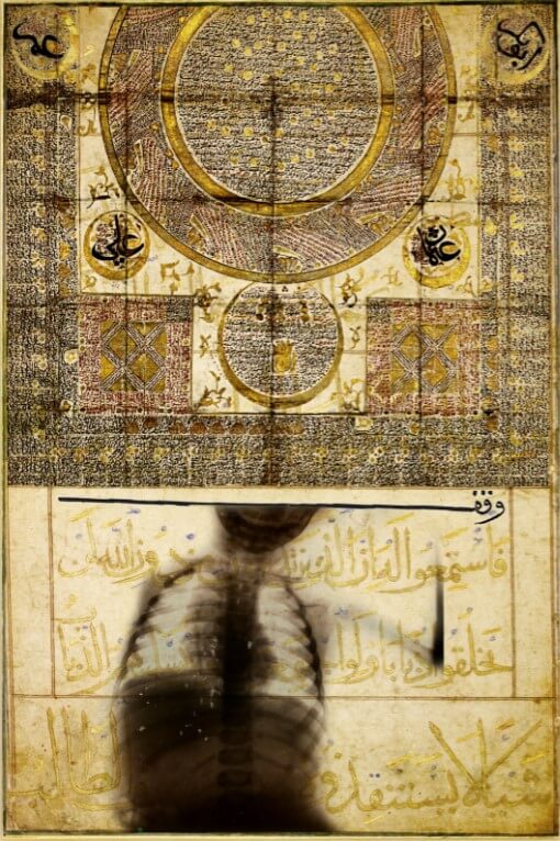 橫跨十餘年的 《Illuminations》(2006-2017)系列,是 Mater 藝術生涯中具標誌性的轉捩點,這個系列完美展示他如何大膽地將「現代醫學影像」與「傳統伊斯蘭美學」進行對話。他以人類軀體的 X 光片作為基底,並在這些膠片上,手工繪製精緻的伊斯蘭手抄本裝飾(Illumination)。這種充滿了金箔、幾何圖形與繁複的花卉紋樣常見於古代的《古蘭經》書邊緣。在這一系列作品中,Mater 將冷靜、理性的 X 光片轉化成祭壇式的華麗景觀,彷彿在現代科學的顯影下,試圖尋找文明中永恆的精神靈光。這種融合了理智觀察與感性信仰的語彙,體現了當代中東藝術家如何在劇變的時代中,重新定義肉體與靈魂、傳統與現代的界線。