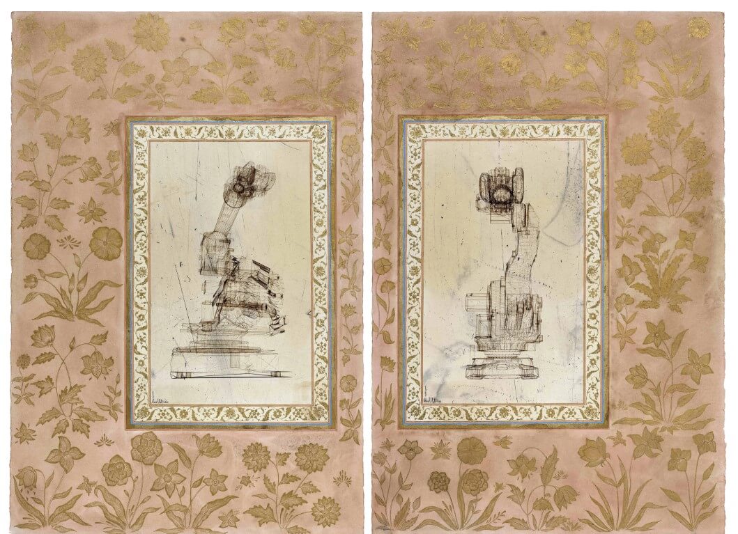 Ahmed Mater, 《Illuminations》〈Illumination Crane Tower (Diptych)〉, 2025, Gold Leaf, Tea, Pomegranate, Ink and Mixed Media on Archival Arche Paper, Two Pieces, Each 152.4 × 101.6cm. ©Ahmed Mater