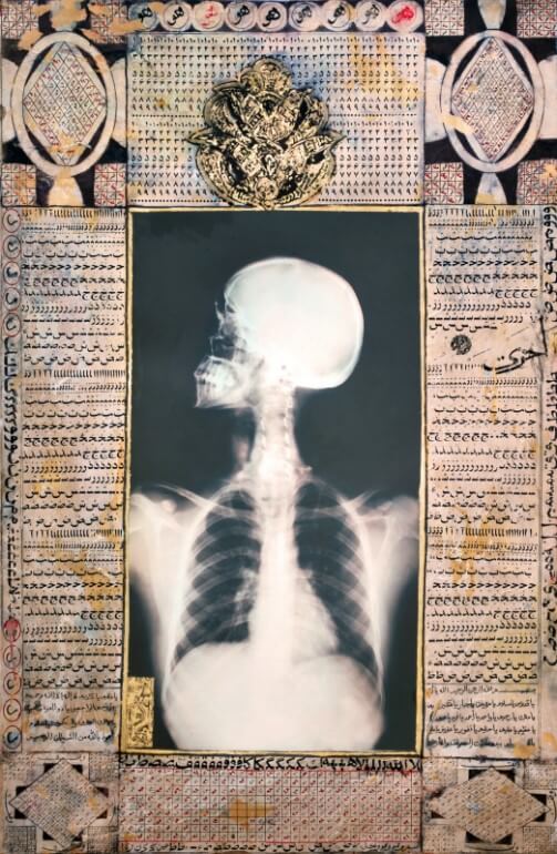 Ahmed Mater, 《Illuminations》〈Talisman X Ray III〉, 2008, Gold lead tea pomegranate Dupont Chinese ink Offset X-Ray print and mixed media on archival, 155 × 105 cm. ©Ahmed Mater