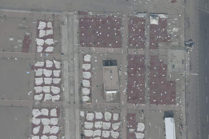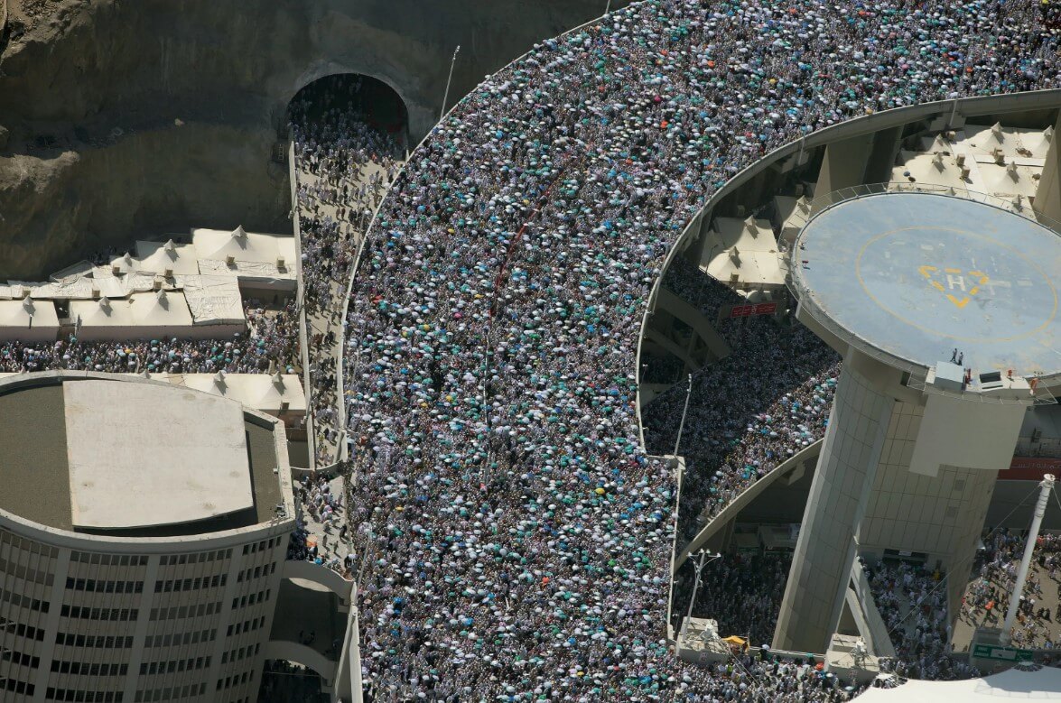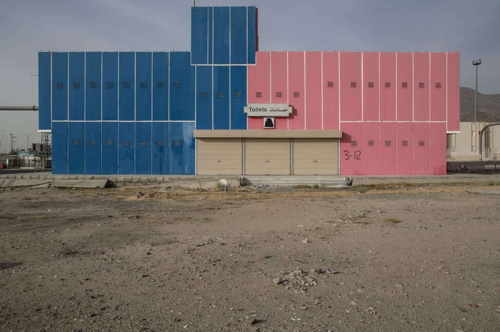 歷時數年創作的《Desert of Pharan》(法蘭沙漠)透過數百張照片和影片記錄了伊斯蘭教聖城麥加(Makkah)短時間內的劇烈擴張。在 Mater 的鏡頭下,這座城市並非固定的永恆符號,而是一個處於動盪、重組與演進中的生命體。標題「Pharan」取自麥加的古稱,意指《舊約》中記載、環繞聖城的自然原野-帕蘭沙漠(Wilderness of Paran)。藝術家刻意選用這個帶有原始、荒野感的名字,來對比如今麥加佈滿起重機、霓虹燈與五星級飯店的景象,不僅揭示了地景的更迭,更凸顯出兩種文明的錯位。