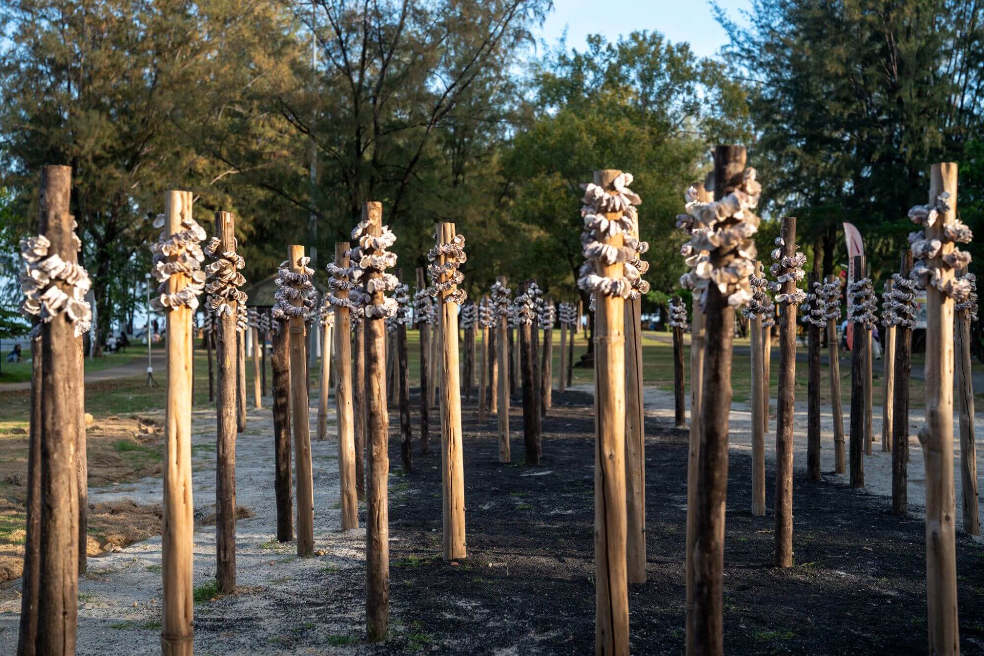 Megan Cope, Kinyingarra Poles, 2023-2024, Saphan Hin Park, Thailand Biennale Phuket 2025. Courtesy of the artist and OCAC.