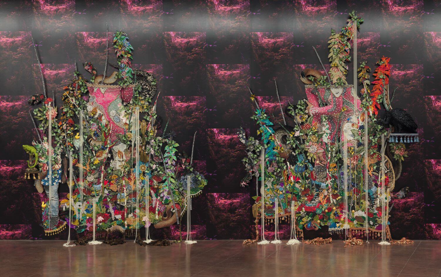 moniquemeloche|Ebony G. Patterson, ….’in the swallowing…she carries the whole…the hole, 2021-22, hand-cut jacquard woven photo tapestry with appliqué, fabric, plastic, beads, feathers, trim, glitter, and wood mounted on wallpaper in 2 parts 325.1 x 556.3 x 38.1 cm (total). Photo: JSP Photography. Image courtesy of the artist and Monique Meloche Gallery.