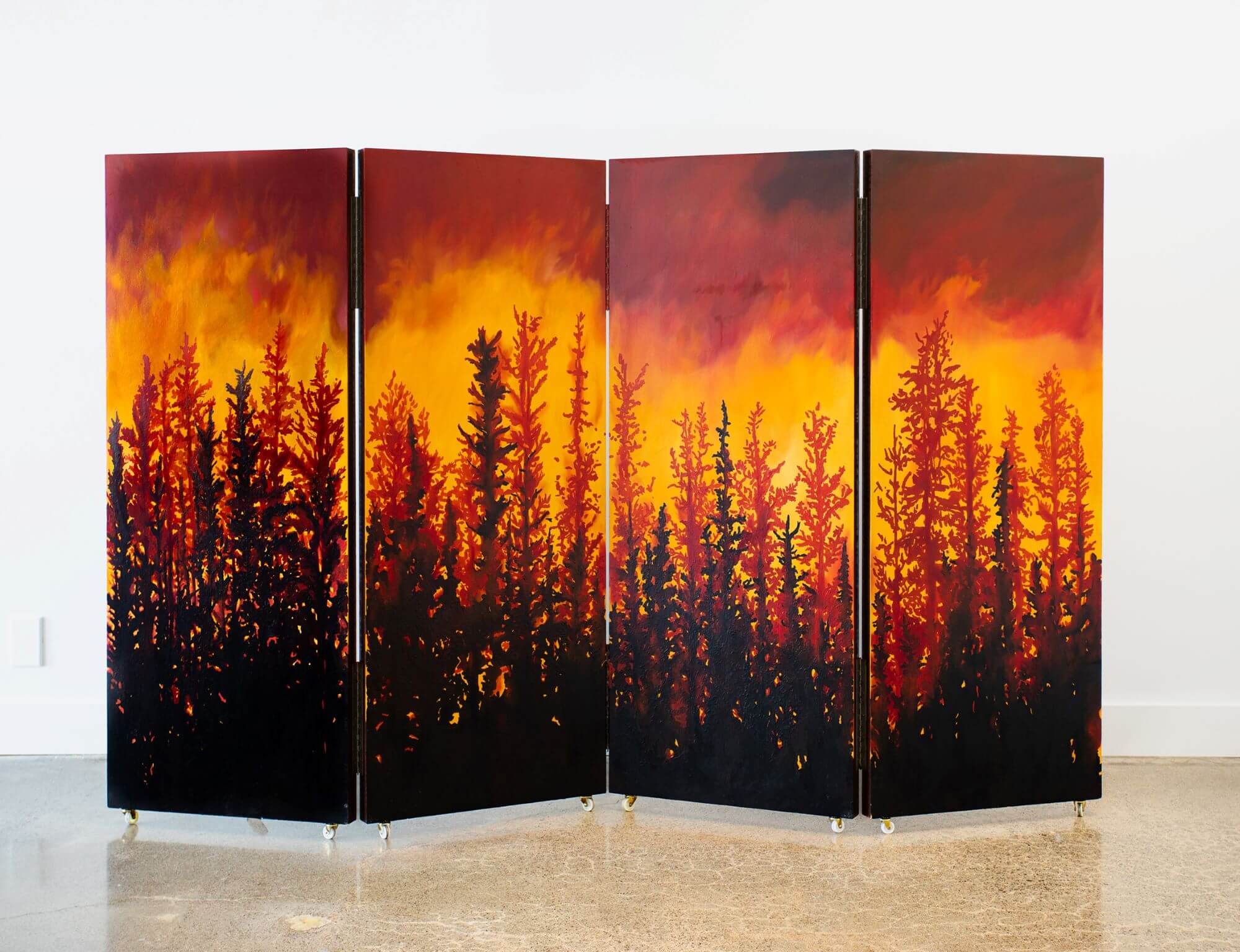 Various Small Fires|Jessie Homer French, Forest Fire(screen), 1996, Oil on canvas 4 Panels, 60 x 24 each, 4 Panels 152.4 x 60.96 cm each. Courtesy of the artist, MASSIMODECARLO, and Various Small Fires.