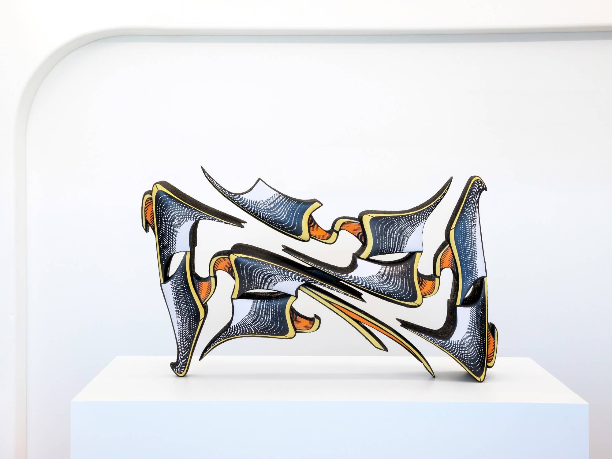 ■ 波莉·博蘭德(Polly Borland) 將展出其生涯至今體量最大的作品 《BOD》(2023)。這件七英尺高(約 213 cm)的鑄鋁雕塑延續了其標誌性的「軟雕塑」風格,將以往用填充褲襪包裹模特兒的獨特手法,轉化為巨大的實體形態。作品表面塗覆霧面汽車漆,呈現出抽象且富有肉感的視覺張力,將她早期的攝影與編織實驗轉化為空間雕塑,進一步拓展對人體邊界的探索。本次 《BOD》 的展出由 UAP(Urban Art Projects)贊助支持。