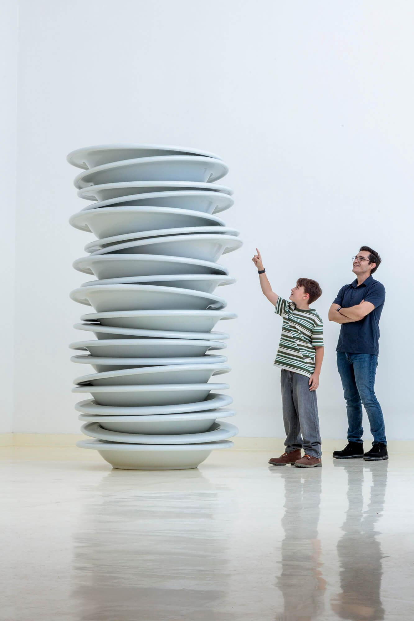 Robert Therrien, No title (stacked plates, white), 1993, ceramic epoxy on fiberglass, 238.76 x 152.4 x 152.4 cm. Courtesy of artist and The Broad.