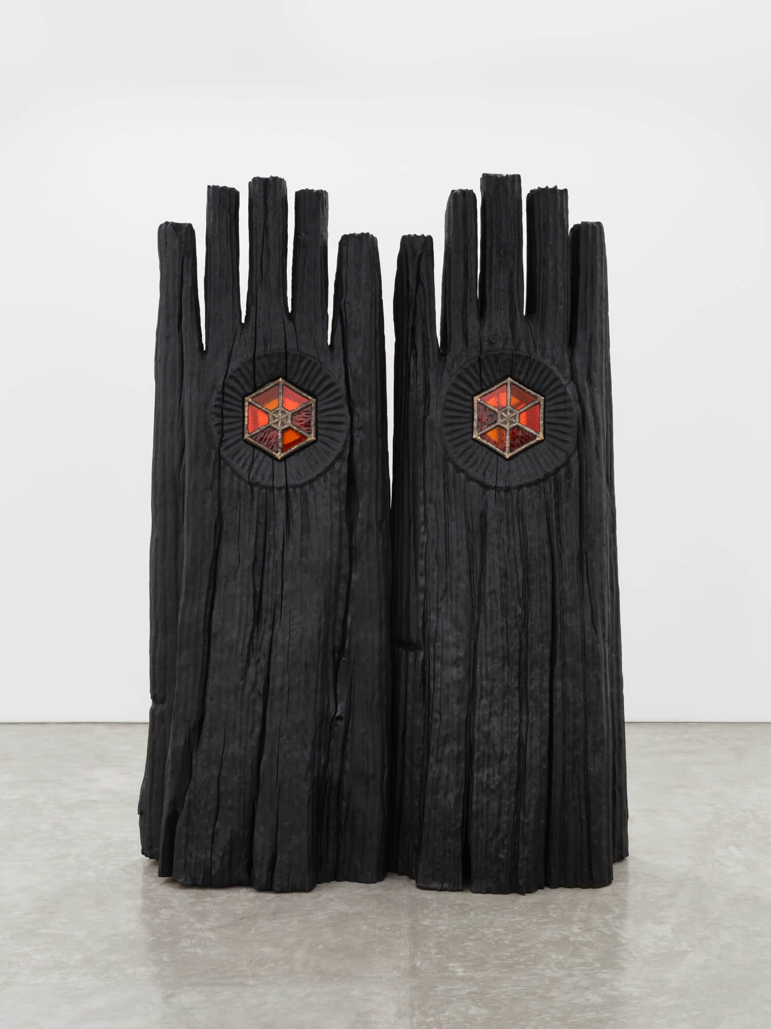 ■ 由丹·約翰·安德森(Dan John Anderson) 創作的大型雕塑 《Threshold》(2025) 與 《Terra Seer》(2025) 首次於戶外展出。在 Night Gallery 的支持下,《Threshold》透過焦黑木質結構中央的暖色玻璃過濾光影,營造出神祕的視覺效果;而 《大地先知》則以青銅鑄造的雙眼,呈現出形體在土地間沉浮的意象。這系列作品展現了安德森對木材的靈性崇敬,並成功模糊了雕塑、家具與圖騰之間的界線。