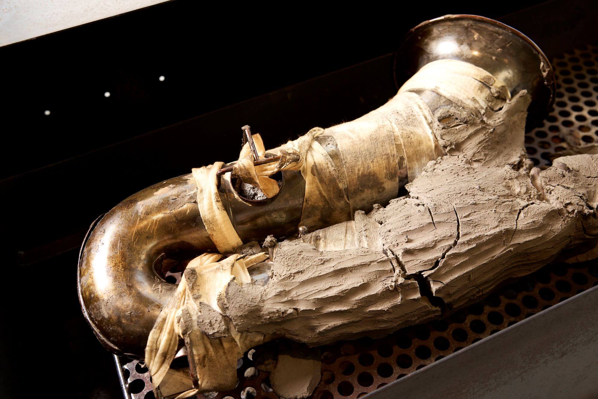 Patron|Jamal Cyrus, ‘Horn Beam Sacrament’, 2025 Sawhorses, custom-made steel and wood smoker, tenor saxophone, gauze, Mississippi River mud, sargassum, railroad spike, hardwood charcoal, cherry and hickory wood chips, and residues from Mississippi River water, aloe, Twinkle Silver Polish, oud, frankincense, and myrrh 90.8 × 106.7 × 65.4 cm Photo: Contemporary Art Museum, Saint Louis.