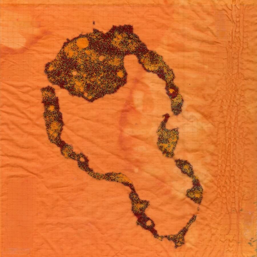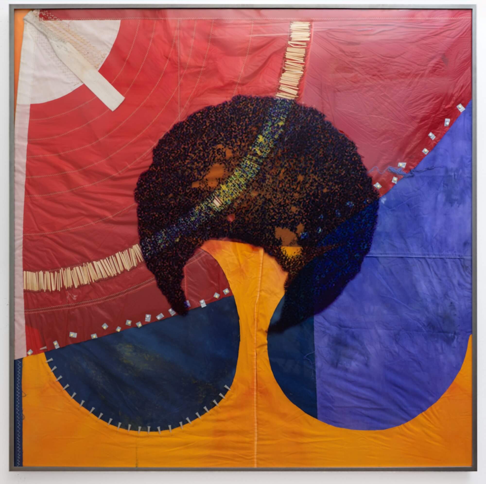 Dreamsong|Tamar Ettun, ‘Embryo Collage 3’, 2025 UV print on plexiglass, hand dyed fabric, sails, gauze pads, birth control pills, syringes, matches, sewing pins, thread, aluminum frame. 49 x 49 inches. Courtesy of the Artist and Frieze.
