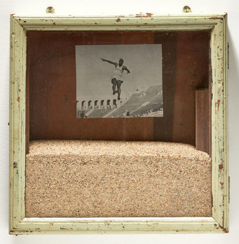Turiya Adkins, Afronaut, 2025, Sand, collage and medicine cabinet, 63.5 × 63.5 cm. Courtesy of Artist and Hannah Traore Gallery.