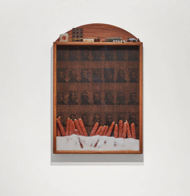 Turiya Adkins, Vertigo, 2024, Salt, corn cobs, acrylic and misc trinkets in hard wood case, 61 × 89.5 cm. Courtesy of Artist and Hannah Traore Gallery.