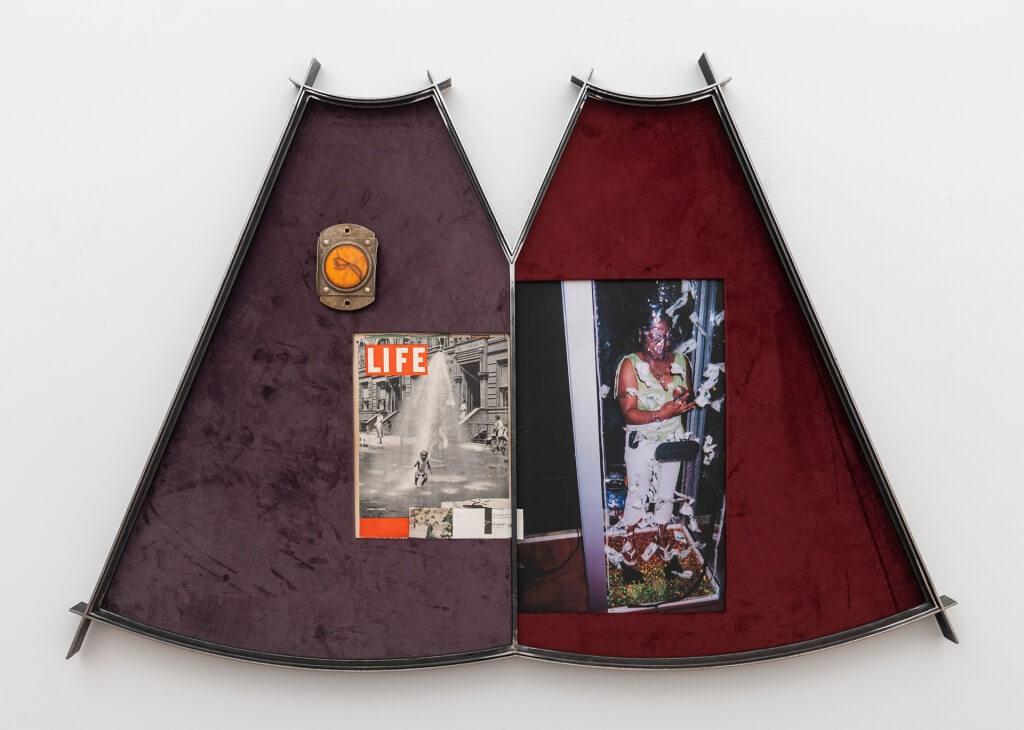 Murmurs|Y. Malik Jalal, ‘SPAN NO. 5’, 2024 Found photography, highway reflector, collaged images, velvet, steel 109.22 × 157.48 × 6.35 cm. Courtesy of the Artist and Frieze.