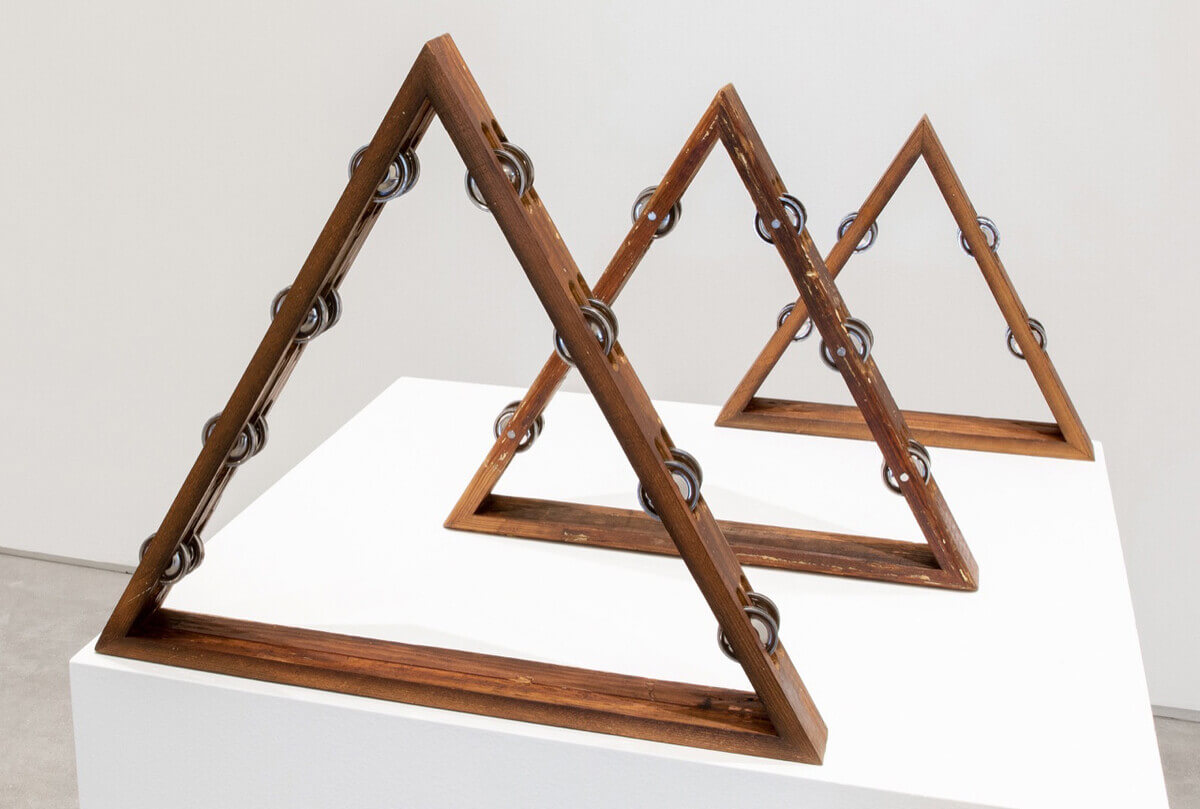 Jamal Cyrus, baia de todos os santos, 2022, reclaimed wood, tambourine zills, 30 x 30 x 30 inches pedestal dims. Courtesy of the Artist.
