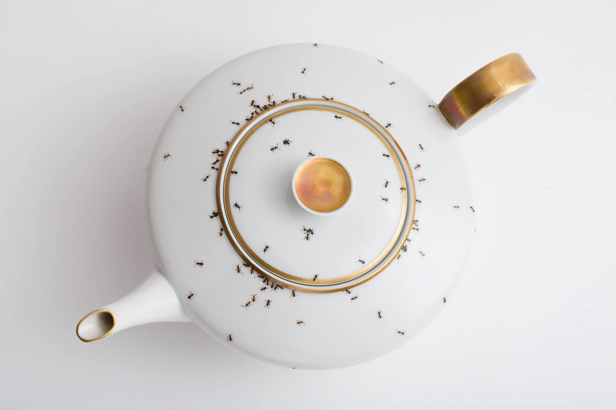 Trimmed with gold and minuscule insects, Evelyn Bracklow’s porcelain dinnerware is equal parts pristine opulence and repulsion. The German artist (previously) hand-paints vintage pieces with tiny black ants that congregate over an imaginary morsel left on a plate and crawl along the mouth of a pitcher, transforming the ceramic vessels into distasteful displays.